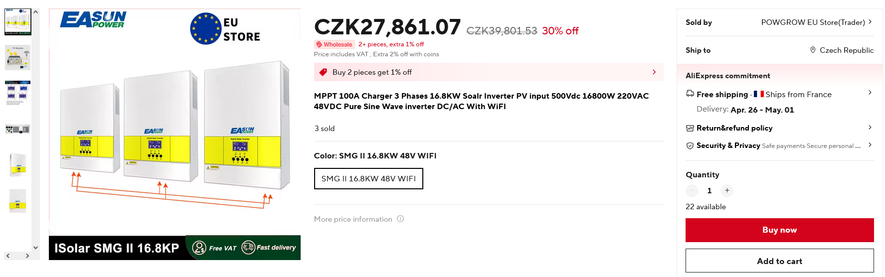 Včera jsem objednal Easun 11KW 150A - na www.easun-energy.com - máte s tímto prodejcem někdo zkušenost? jak jsou rychlí v dodání?