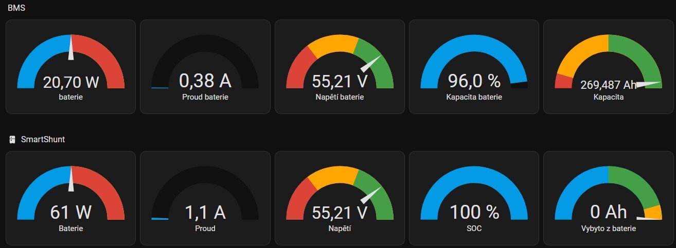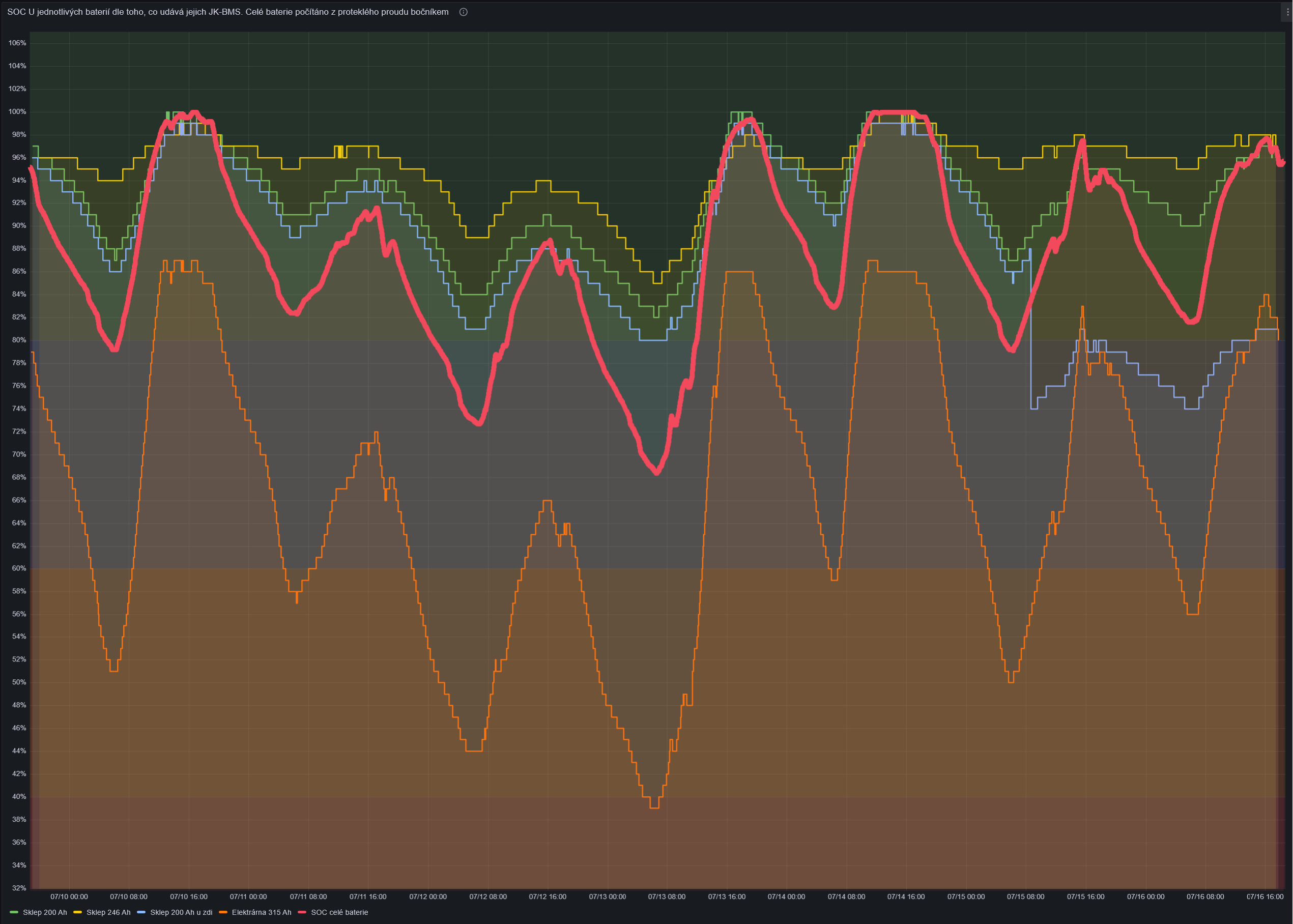 Mám tak vše pod kontrolou, reset může být manuální nebo automatický a i při své jednoduchosti je přesnost pro mě dostatečná. (SOC jednotlivých baterií se tady porovnávat mezi sebou nedá - baterie u elektrárny se vybíjí více, než ty ve sklepě - vliv dlouhých přívodních vodičů)