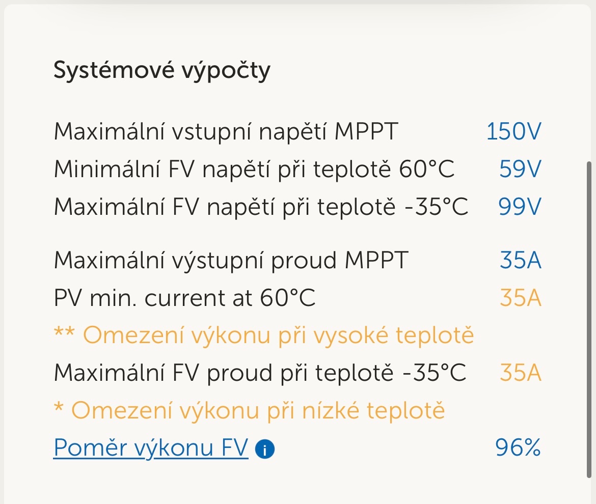 Hodil jsem to do konfiguratoru ale jak zvednu teplotu nad 60C uz to nevychazi takze asi se budu muset podivat po necem jinem. Na druhe strane mam stringy 4S nejakych 200V VOC a zatizene maji kolem 150V a kdybych to delal znova uz delam taky jen 2S.