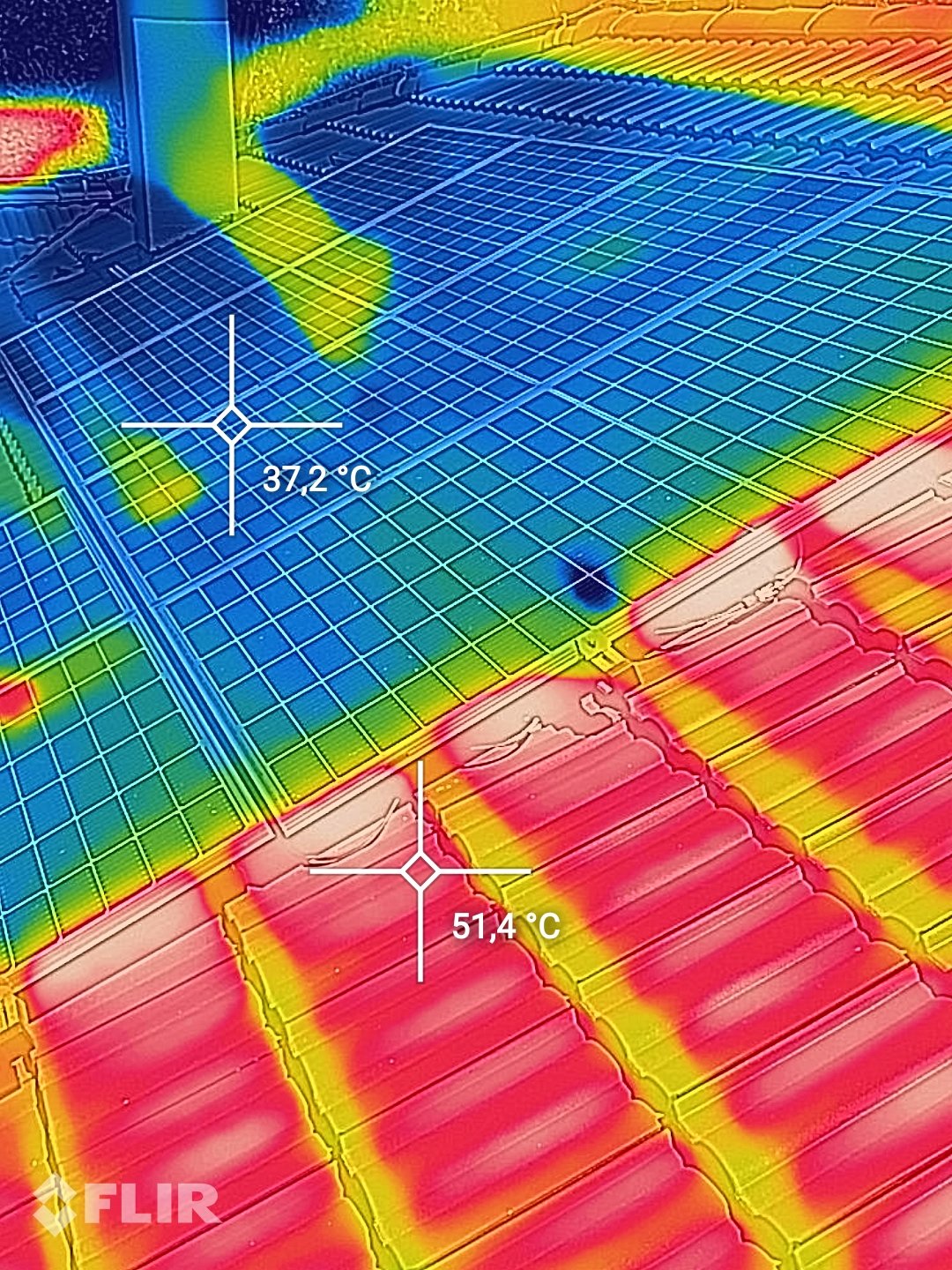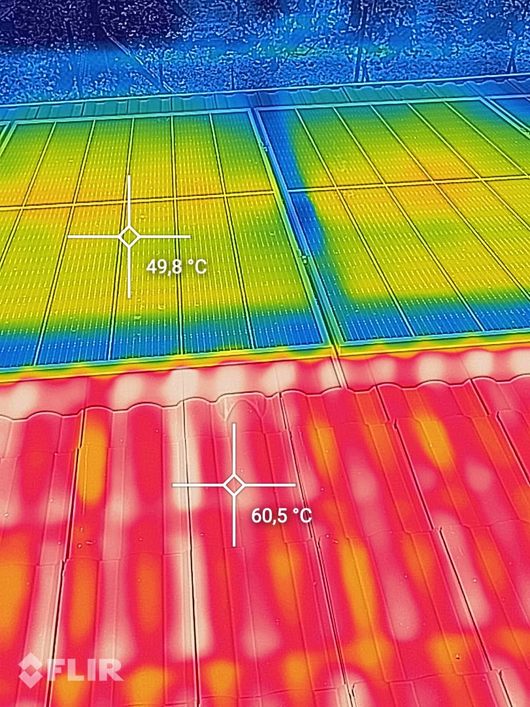 V hodnocení absolutní teploty fv panelů termokamerou bych byl opatrný. Relativně - nalezení hot spotů OK. Údaj je ovlivněn emisivitou, odrazy, ....