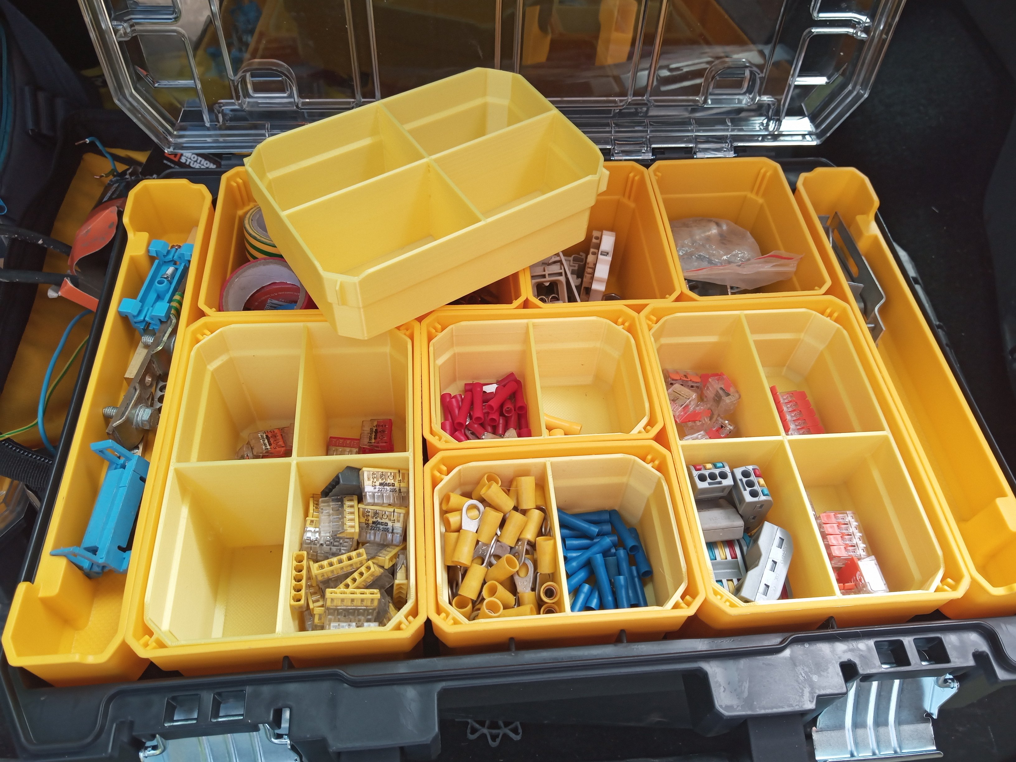 taky se pochlubím krabičkama: akorát já jsem si je našel tuším na printables, ale byly špatný, byla tam mezera od horního krytu a přesypávalo se to z jednoho do druhýho, tak jsem to přímo ve sliceru zbastlil tak, že jsem dal dva modely na plochu, z jednoho jsem nechal uříznutej horní konec a ten jsem plácl na ten původní sorter. No a nakonec jsem udělal ještě jedno řezání, a to to, že jsem uřízl ten lem a pak ten mělčí vyjde pod druhej mělčí. Potom je jediná nevýhoda, že tam nevidíš, co tam je. Ale zatím se to snažím udržovat v nějakým pořádku a logice, tj pod očkama jsou další očka, jenom jinej rozměr.