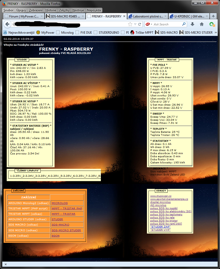 24x Solární panel JINKO SOLAR 225 Pmpp=225W, 2x Regulátor STUDER VT-80, 2x Střídač Studer XTM 4000-48, BSP, RCC, 1x AKU 48V LFP200Ah 1x AKU 48 V LFP280Ah. Řizení a dohled, SDS, vlastní vyčítání arduinem DUE v krabičce (ARMOSY), export dat do RPi s databází a html stránkou.