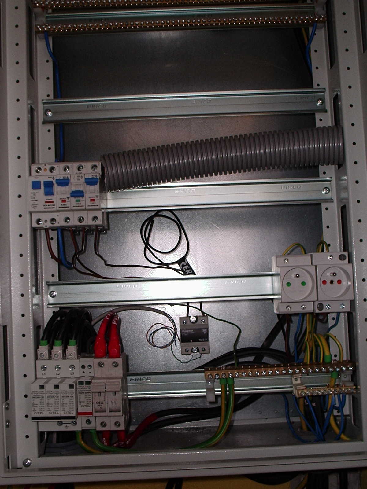 Na fotce odkrytovaného hlavního rozvaděče je SSR pro přebytky prozatím na pravou zásuvku. Až bude akumulační nádrž tak to připojím na topné těleso. Jako chladič SSR je použitá montážní deska v rozvaděči. Místo pro další jističe pro celou elektroinstalaci domu, na připravené propojovací liště jističů je navlečená chránička.