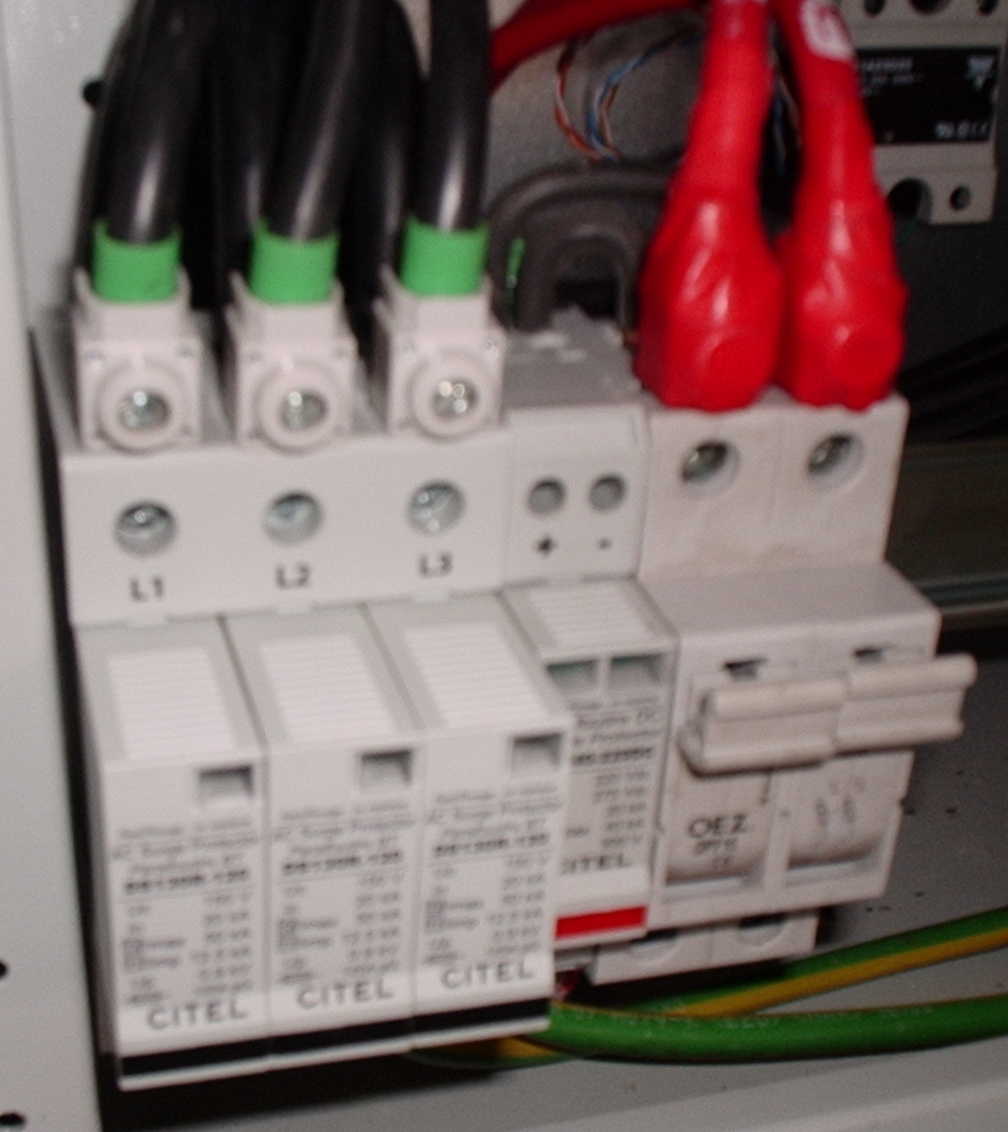 Přepěťovka pro FVE je CITEL DS240S-220DC, na 220DC. (Regulátor snese 250V + napětí baterie). Tato přepěťovka je dvoupólová, standardně chrání kladný a záporný pól vůči zemi. Ale v tomto zapojení 2 x 3,15kW FVE se společným uzemněným pólem chrání pouze dva různé kladné póly proti zemi a tedy i zápornému pólu. Značku záporného pólu na přepěťovce tedy musím přeznačit na kladný pól. Ty dva póly přepěťovky jsou totožné, ověřeno u výrobce.