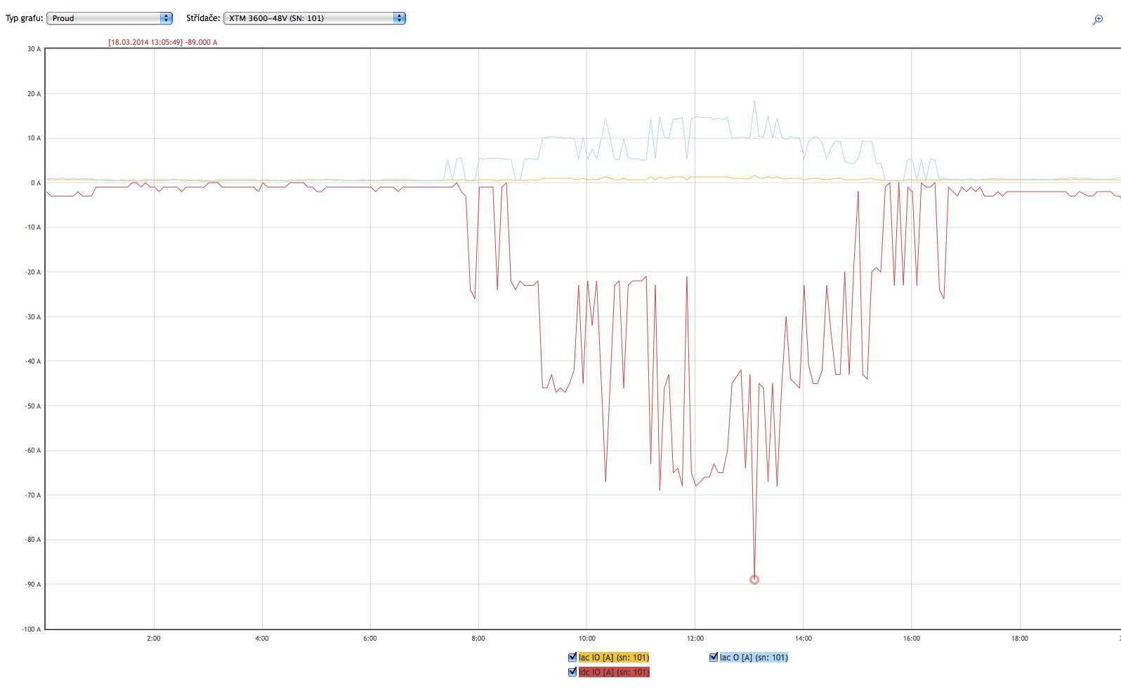 Takhle můžou vypadat proudy ze Solarmonitoru v RD s XTM-4000-48 na skoropočátku jara