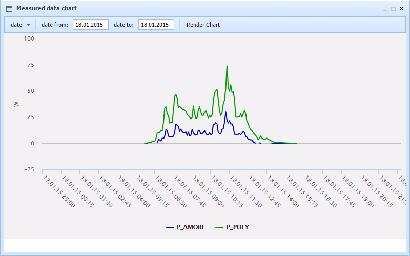 P_amorf červenou barvou, jede z rána do svého maxima 31,7W a pak padne dolů a celý den už se moc neozve, kdežto P_poly lítá nad nulou skoro celý den. Chtělo yb to opravdu změřit dodanou energii ve Wh, aby se to dalo objektivně posoudit.