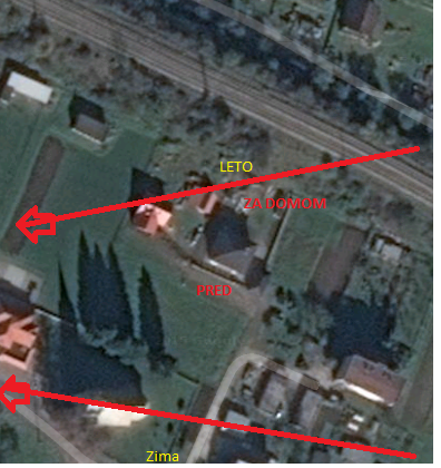 Som to asi zle napísal alebo zle vysvetlil. Dom má strechu v tvare ihlanu. Na obrázok som nakreslil čo som myslel tým pred a za. Slnko cez leto ide poza chalupu a cez zimu ide pred chalupu. Smer nepodarenej šípky určuje západ.