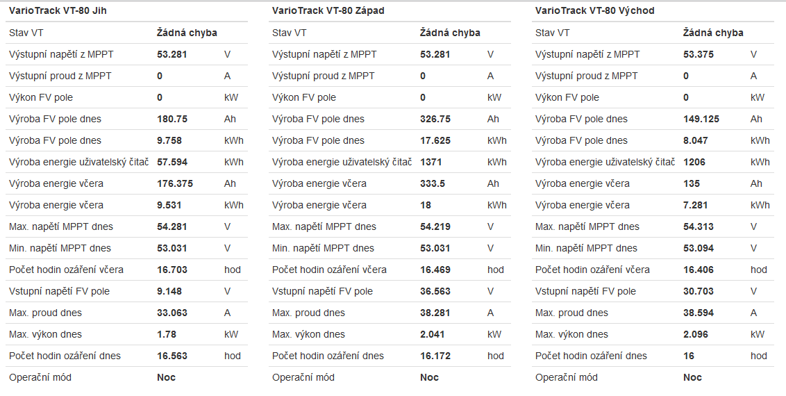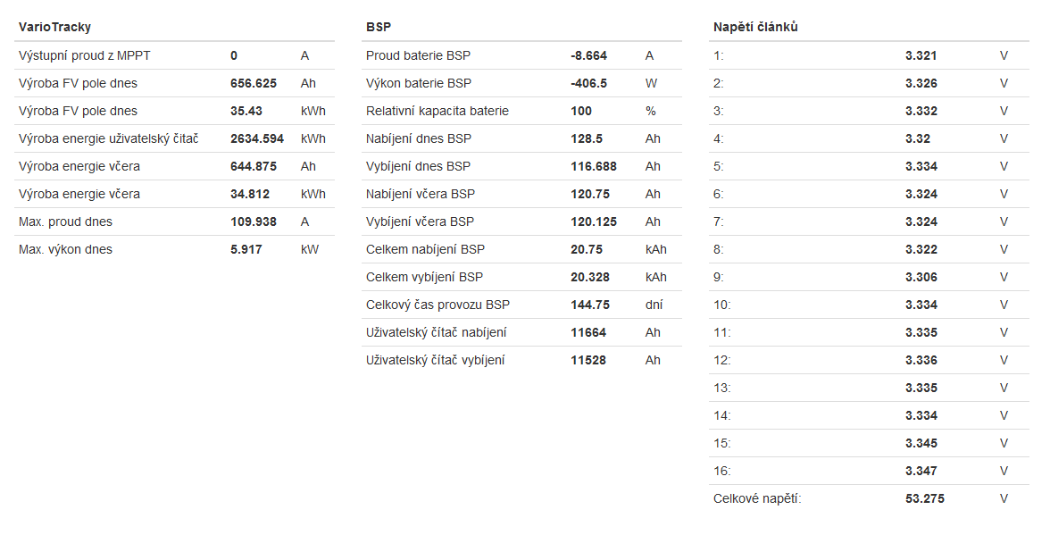 24x Solární panel JINKO SOLAR 225 Pmpp=225W, 2x Regulátor STUDER VT-80, 2x Střídač Studer XTM 4000-48, BSP, RCC, 1x AKU 48V LFP200Ah 1x AKU 48 V LFP280Ah. Řizení a dohled, SDS, vlastní vyčítání arduinem DUE v krabičce (ARMOSY), export dat do RPi s databází a html stránkou.
