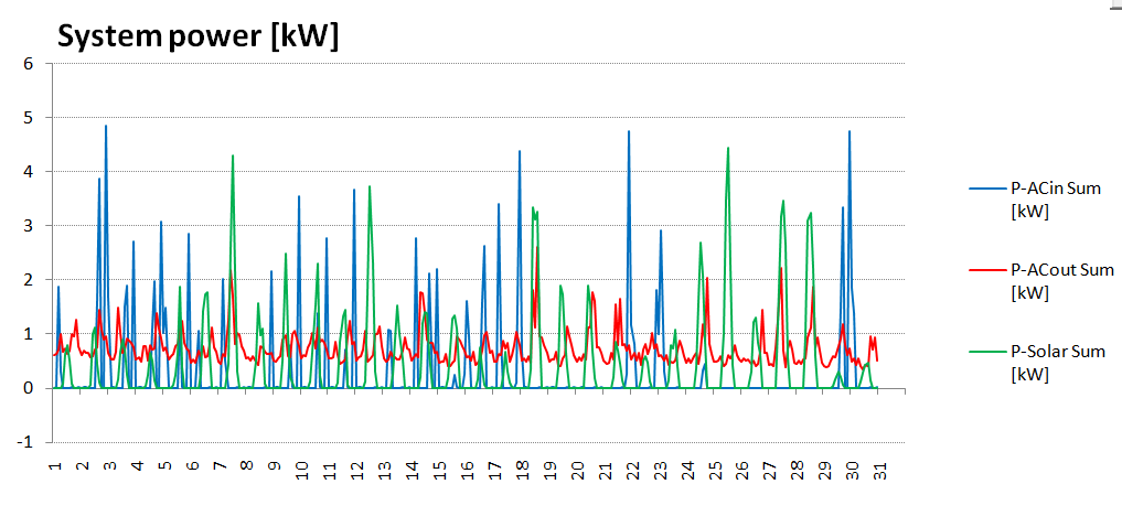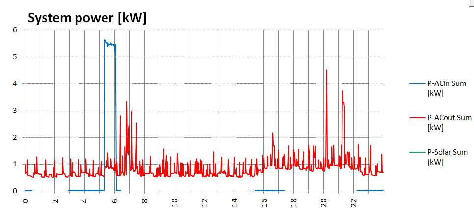 Můj běžný den.Spotřeba kolem 19 kWh.Je to taková zubejda.To proto že mám dvě čerpadla,která neustále zapínají,jak se zvedne hladina vody ve sklepě a pod bazénem.Dále rekuperace.Ta spíná podle vlhkosti a nébo podle co2.Je to asi většina spotřeby přes den.