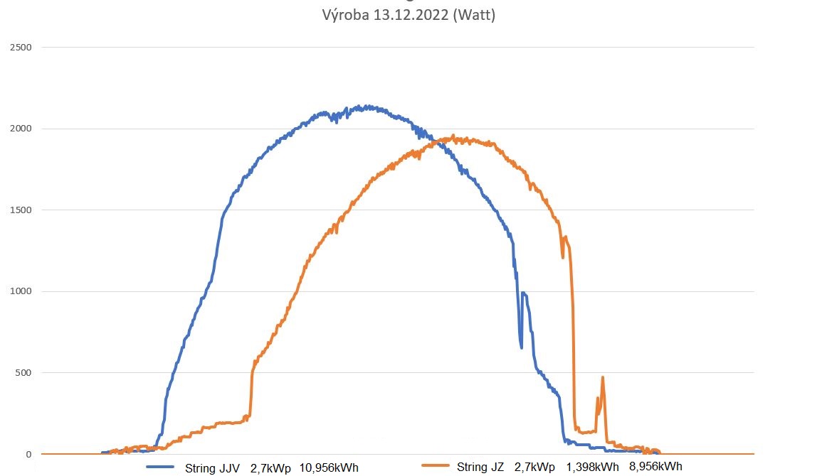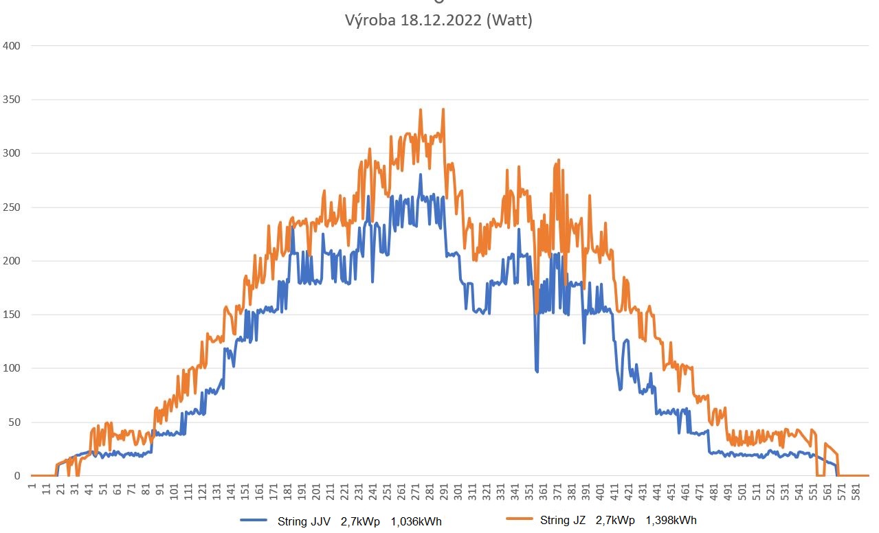 Tak mi to nedalo a vytáhnul jsem výkonové grafy ze dvou prosincových dnů a doplnil výrobou energie na každém stringu.
