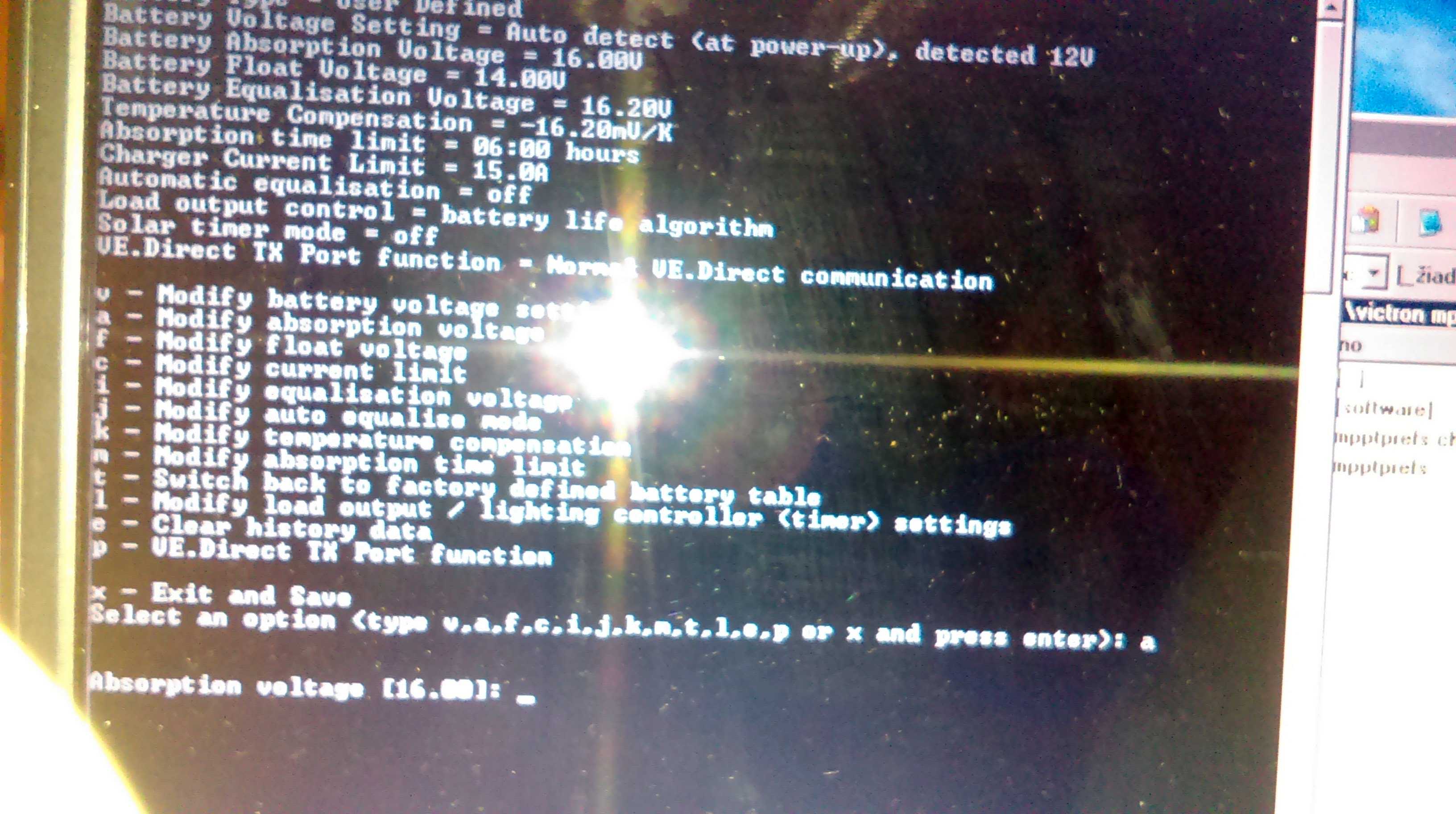 Tak nový regulátor pripravený na zapojenie do ostrovčeka. Vďaka nemeckým foram, stránke výrobcu a pomoci člena kodl69 s výrobou galvanicky oddeleného káblu USB-TTL sa podaril úspešný upgrade regulátora ako aj zmena niektorých hodnôt pre float a absorbtion - nastavenie na 10 čl /12V/ NI-CD bateriek. Vďaka aplikácii pre Android funguje aj monitoring, ale len okamžitý a 30 dňová história. Snáď sa podarí nejak tieto hodnoty uchovávať na SD kartu a potom preniesť do PC.