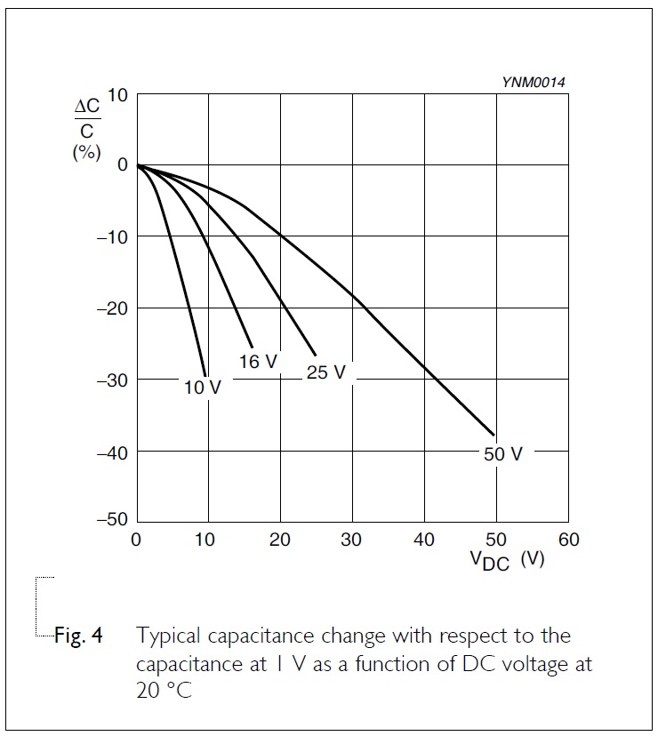 Vzhledem ke skutečnosti, že v uvedeném grafu závislosti kapacity na napětí vychází křivka z nuly DC, předpokládám, že jmenovitá kapacita C je udávána pro nulové napětí, kdy platí, že delta C/C = 0%