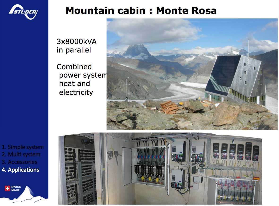 Ověřoval jsem tu Monte Rosu. V roce 2016 je tam nadále Studer Xtender, jen proběhla další modernizace o VS120. Nechápu proč by Studer měnili za něco jiného. Všichni kdo Studer mají, ví že šlape jako hodinky a to včetně pokročilého fungování s generátory (automatická plynulá regulace vstupního proudu, aktvní filtering, časové programy automatického spouštění, 232i, CAN, atd.) V ČR jsou navíc podobných systémů desítky. Xtendery v ČR instalujeme od roku 2009, takže je to poměrně známý systém.