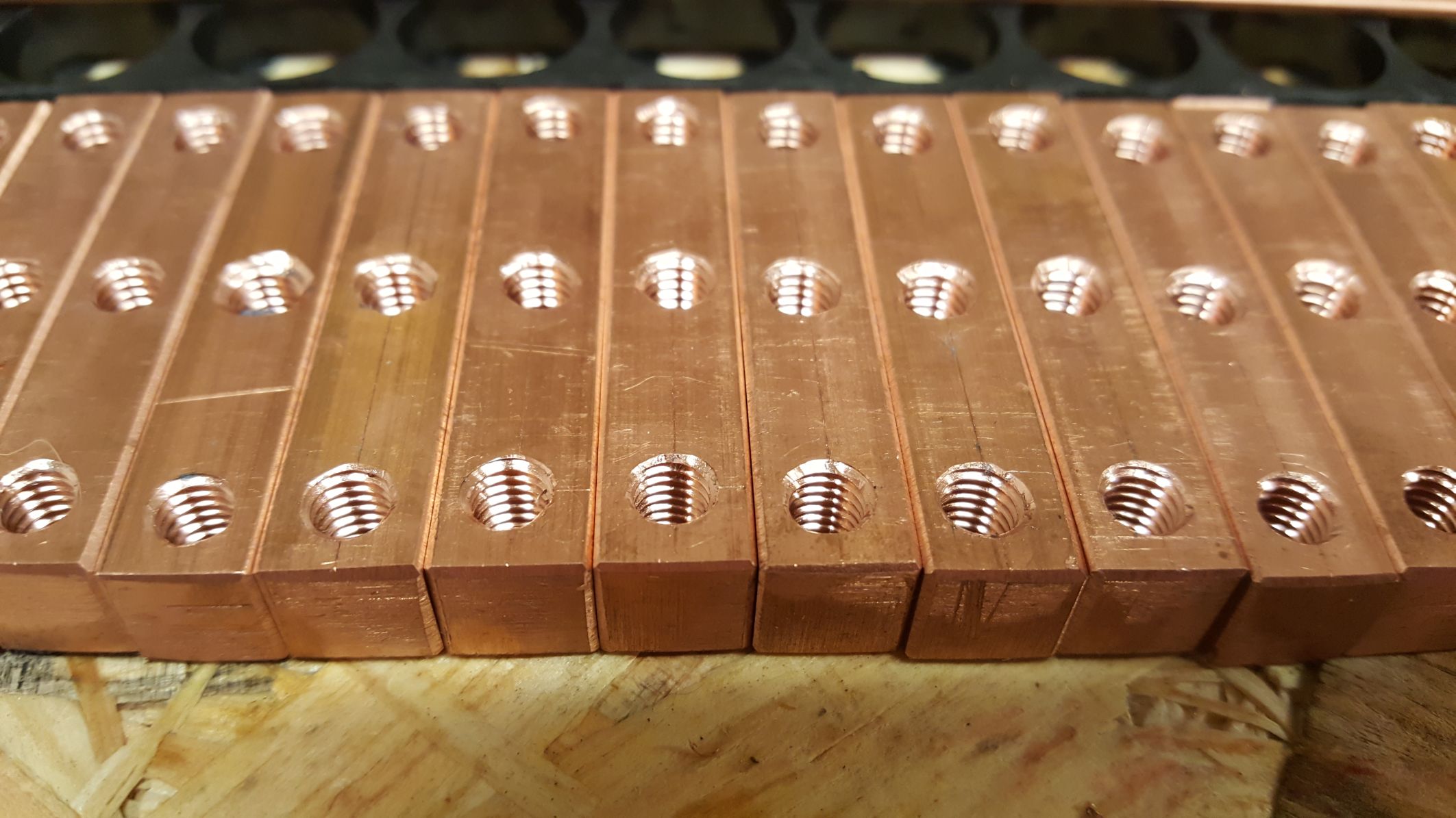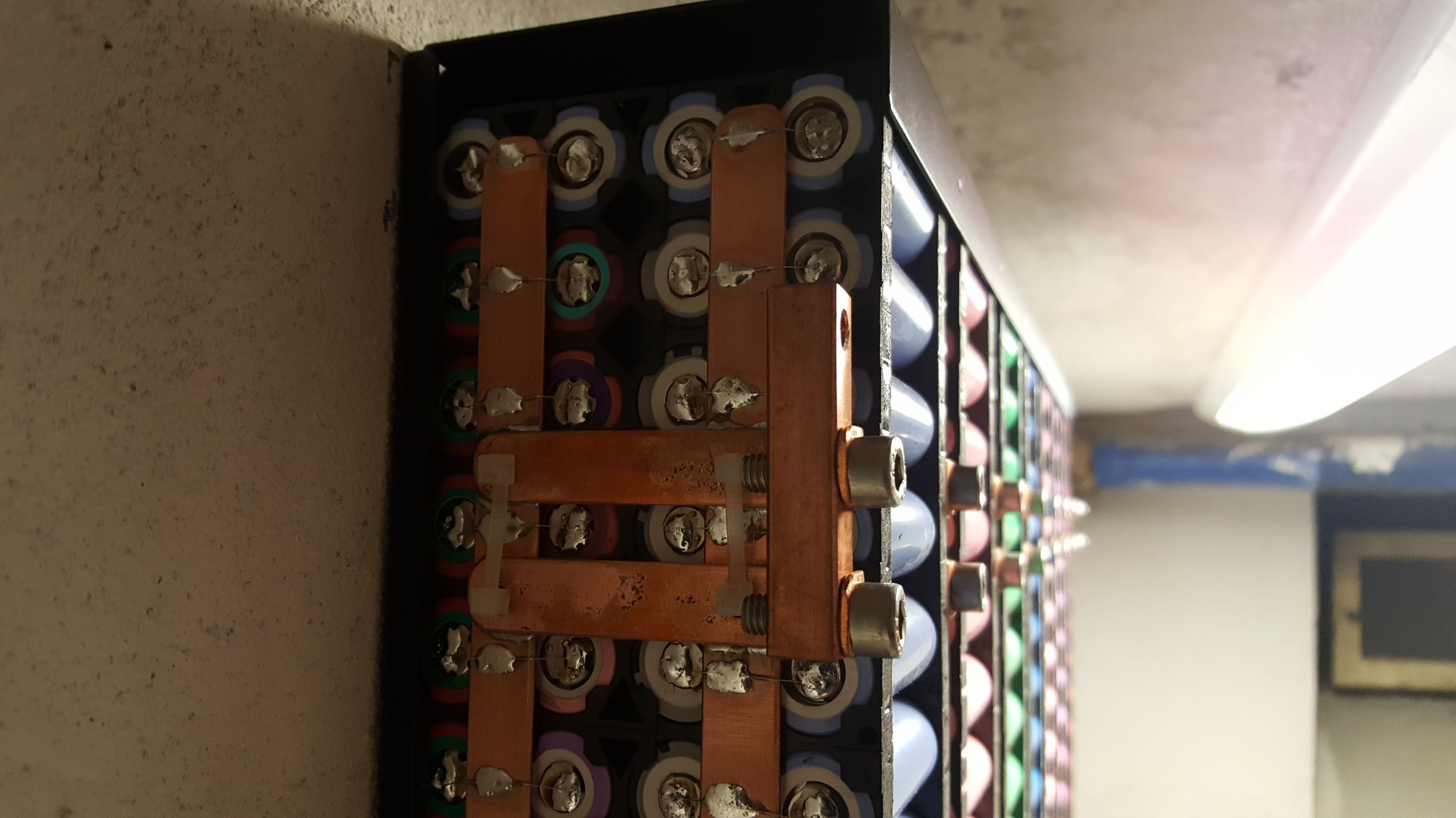 Spousta mědi spousta mědi, nářadí a nástrojů 30 A: 1,1 mV na pojistkovém (měděném pocínovaném) drátku 0,2 mm průměr = 3 mR, 0,3 mV z mědi na měď (mezi 80P a sousedním 80P) = 10 uR, ty bindry mi to trošku kazí, původně jsem vymýšlel zápustné šrouby a izolační tyčku uprostřed, ještě nevím jestli jsem udělal dobře Sešroubovat už to byla sranda, tahle fotka se docela povedla První 80P sadu jsem otočil, mohlo to být ještě hezčí dát dohromady každý jednotlivý a změřený článek >1800 mAh byla docela fuška. Když to dobře půjde tohle je první šestina co se do sklepa elegantně vejde. Cca před rokem jsem začal změřené dělit na sračky <1600 ty jsem zapojoval ihned po 2P14S a ty lepší >1600 ze kterých je tohle.