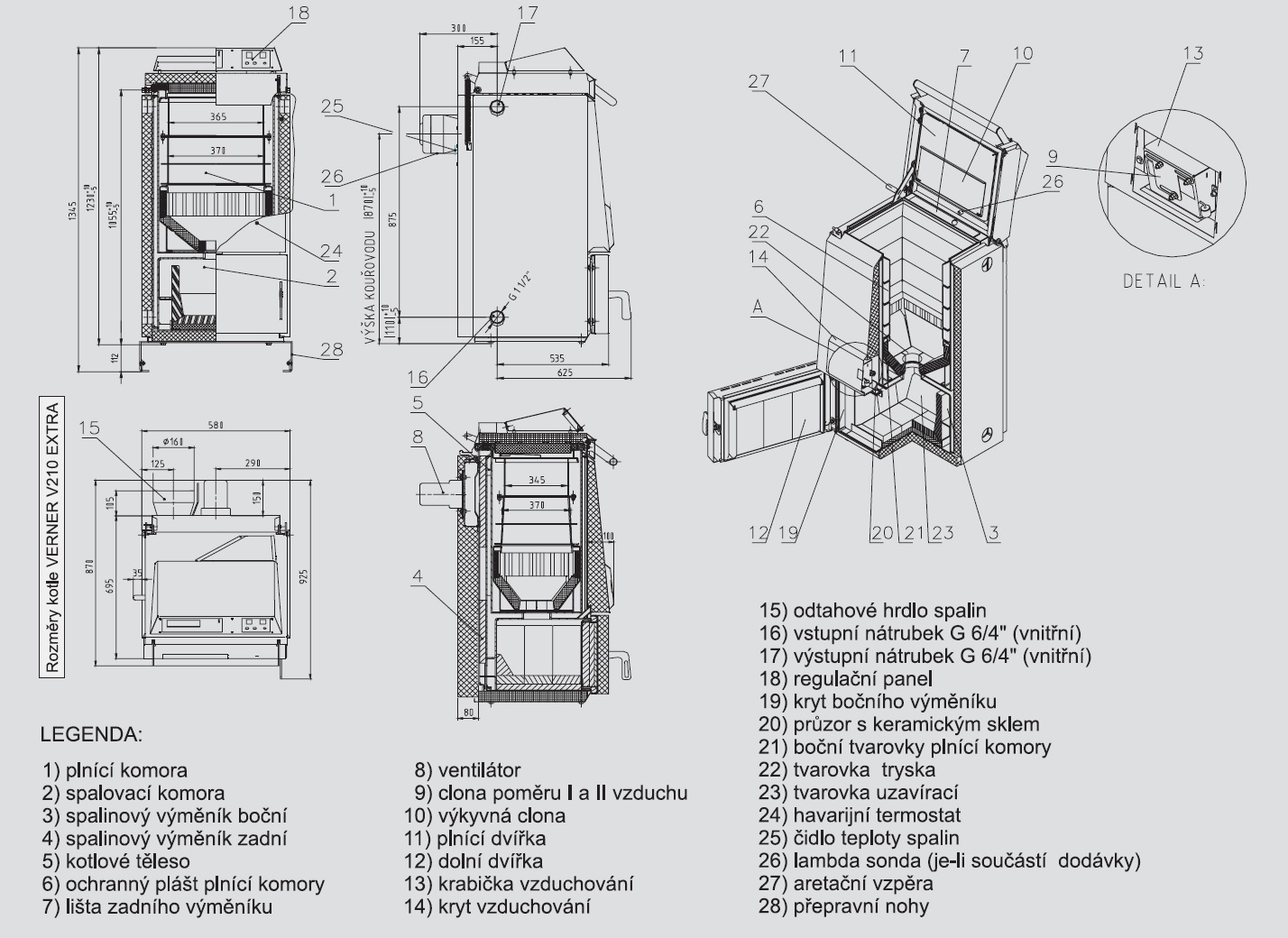 5-ka je komora plech, kde je rozdělen sekundár k trysce 10/17 a primár do ohniště těsněný 23 nad ní(ta žárovka 12) ,je to díl vložený na těsnění 19/20 na středové přepážce s vodou.Záda kotle nejsou oboustranně zavodněná,je tam 12 komor tvořených žebry svisle na zadní desce s ventilátorem,přístup pro jejich čištění je po otevření víka a sundání plechu,který tam nad nima jen leží.Víko má dvojité těsnění vnitřní komora a venkovní těleso, v mezeře mezi je v zadu ten plech a přístup,když to projedeš prach spadne dolů na dno.Po stranách jde vytáhnout ihned po otevření spodních dvířek a sundání krytí spalinových cest 8,za šamotovou dohořívací komorou je nutno vytáhnout zadní klín 15.Za pět minut není co dělat co 14 dní v topné sezóně.