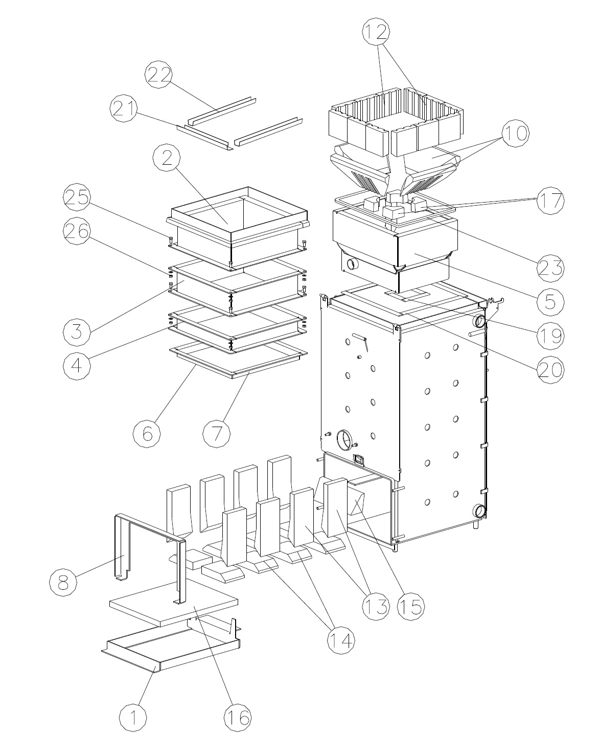 K tomu obrázku kde je šamot a ty nástavky z plechu. Jaký materiál je díl 5? Je to jen plechový díl nebo je v tom vzduchovém vstupu resp. prostoru na dně a stěnách nějaký šamot do kterého se seskládá tryska z dílů 17 a a 10? Načem leží díl 19 a 20? Druhá nejasnost je, co to je ten plech zezadu. Mám to chápat tak, že to nemá ani oboustraně zavodněnou spalinovou cestu a má to jen jakousi desku s pantem pro horní vrata a s odtahovým ventilátorem ?