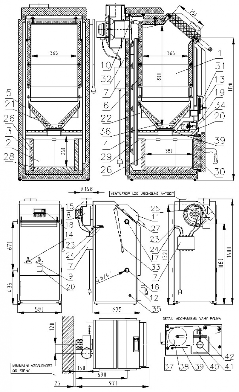 7 a 19 jsou čistící vstupy pro výměník. Tyto prostory jsou jaké? Má kouř jednoduchý chod nebo má nějaké přepážky typu vytahovací plechy? Typuji že nic. Ventilátor jede plynule od nuly do 50 nebo 60Hz? Podle návodu jaksi cyklicky spíná aby kotel správně žhnul.