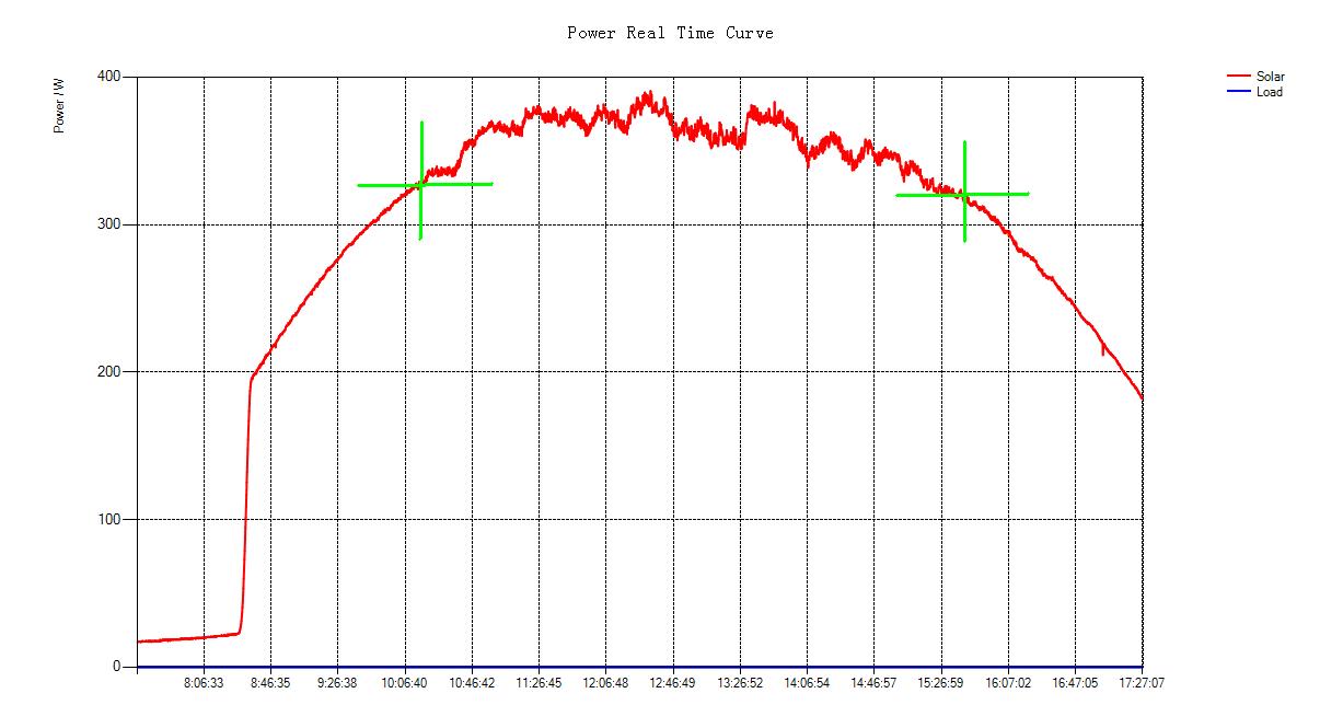 Boli to výborné podmienky pre skúmanie systému s pwm, tak prikladám obrázok so záznamom výkonu z dvoch panelov 240 Wp pripojených paralelne. Počas celej doby boli batérie vzorne stabilizované na 27,1 V.
