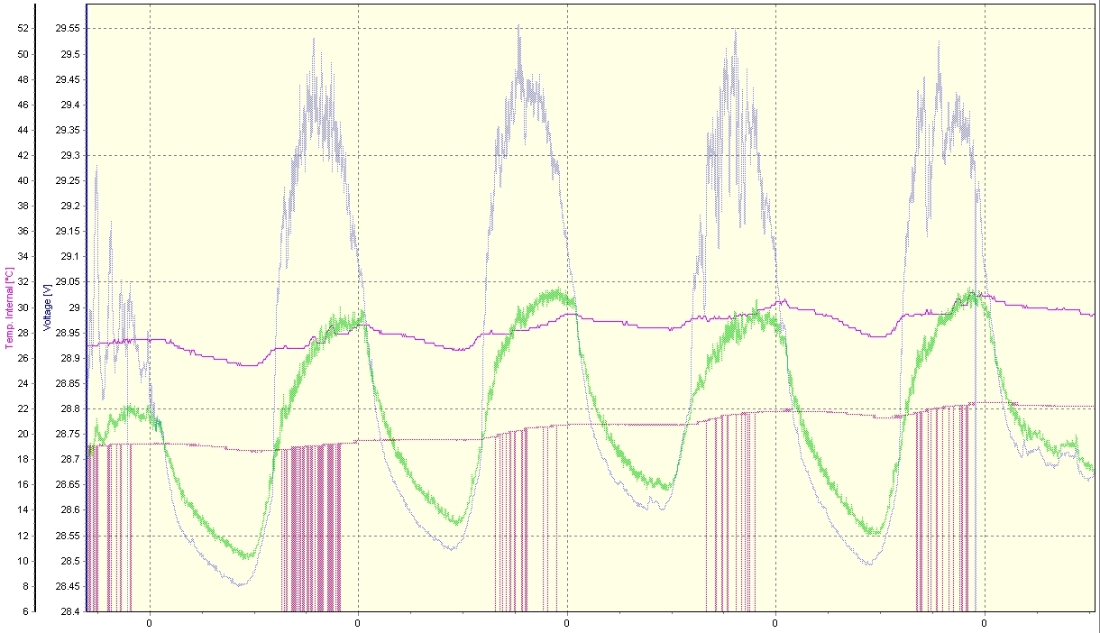 Toto pozorovanie len potvrdzuje závislosť výkonu panelov na teplote. Ukázala sa jasná teplotná hranica 43° C pre pripojené panely, aktuálne oslnenie a čistotu ovzdušia pri uvedenom stálom napätí. Teplotu som priebežne sledoval na loggeri, spoliehajúc sa na čidlo Dallas.