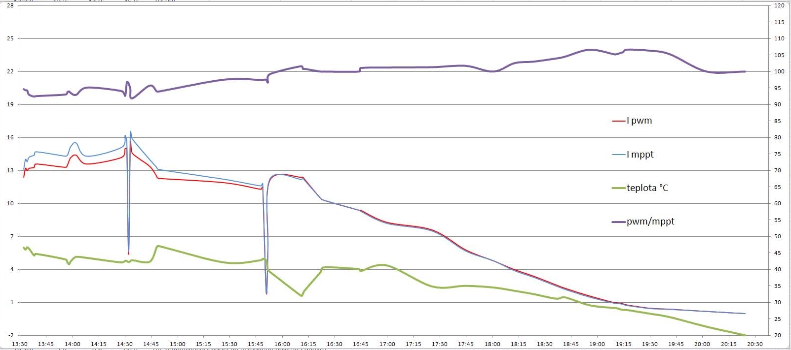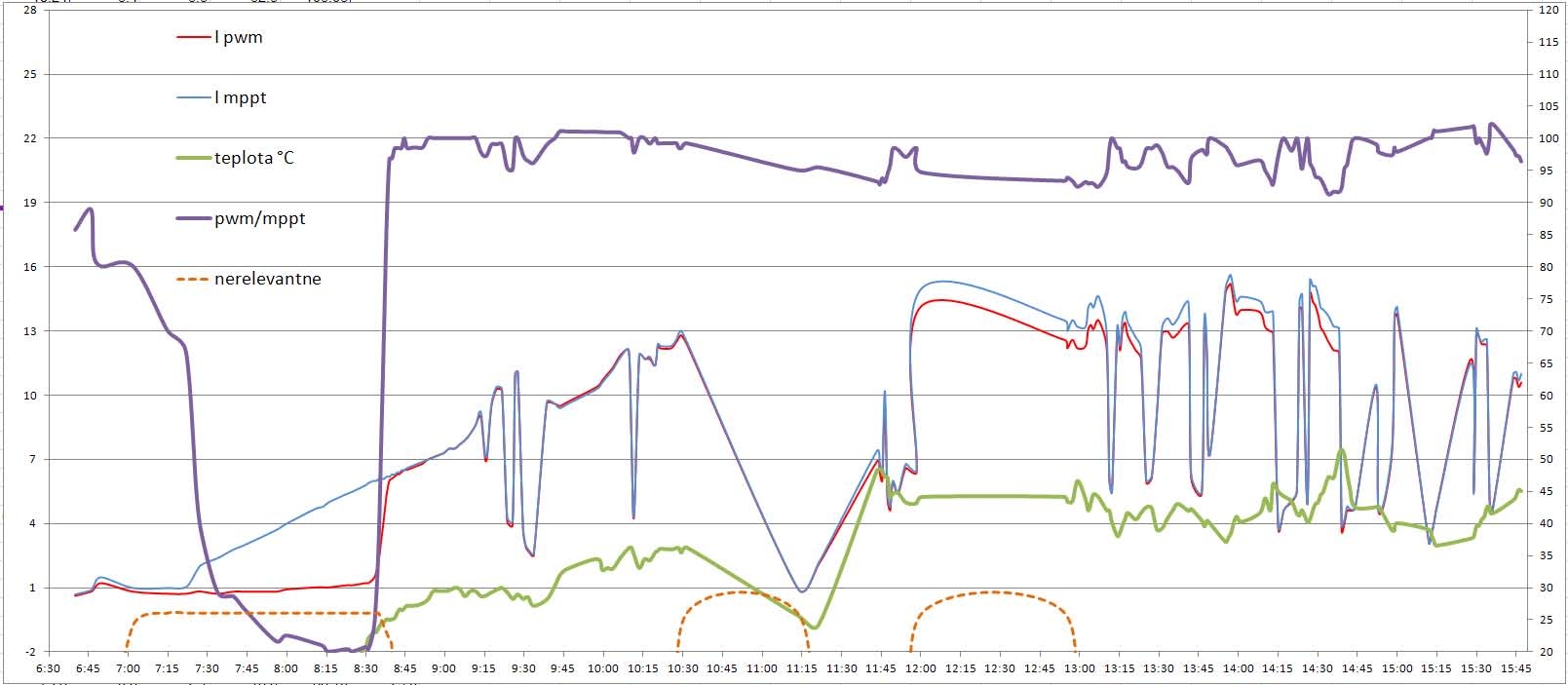 Výsledok je jasný - v čase medzi 10:30 až 16:50 je potvrdené,že teplotná závislosť výkonu použitých panelov dáva na pwm regulátore horší výsledok, ako na mppt regulátore. V ostatnom čase je pwm regulátor lepší. Je viditeľné rozhodujúce teplotné rozhranie na paneloch cca 42 °C.