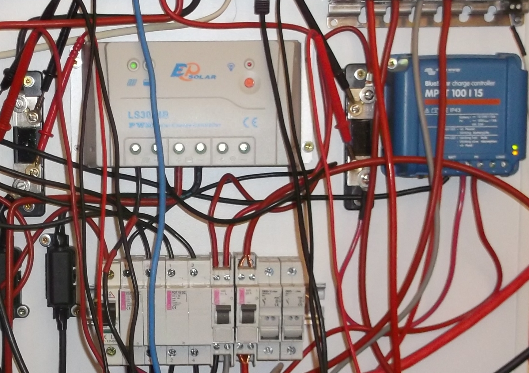 Štyri 4,5 ročné identicky orientované panely LDK 240P-20 ( VOC 37,3 Vmp 29,8 V podľa STC ) pripojené k regulátorom LS3024B ( 2P ) a Victron BlueSolar 100/15 ( 2S ) sú v dvoch radoch za sebou, predný rad je pripojený k Victronu, meranie teploty na zadnom rade.