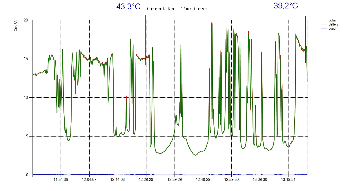 Pridávam obrázok z dnešného dňa, na ktorom vidno, že aj pri striedavej oblačnosti a ináč čistom ovzduší sú prúdy z pwm regulátora nad 15 A. Je veľká škoda, že sú kategórie regulátorov s menovitým prúdom 15 A, na ktorých nie je využitie štandardných ( a najprístupnejších ) FV panelov úplné. To je jediná moja výčitka k Victronu 100/15, ktorý je ináč výborný.