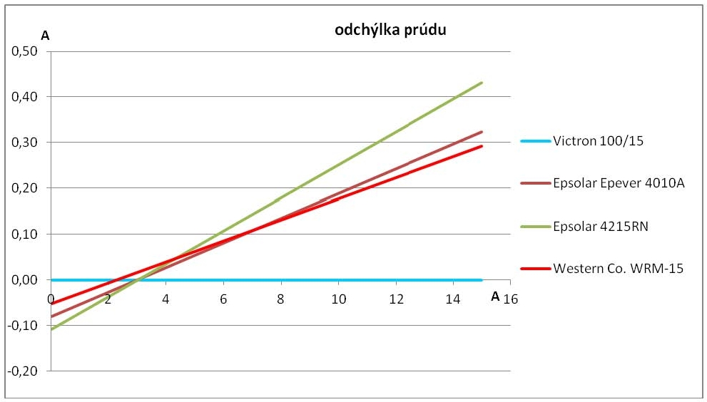 Základné údaje som doplnil v tabuľke nameranými hodnotami prúdu pri stabilizovanom napätí batérie 26,8 – 27,1 V. Vyhľadával som pritom režimy s dostatočným oslnením dvoch rovnakých polí 2S ( panely LDK 240-20 ) s rovnocenným pripojením k regulátorom. Pri porovnaní výsledkov som zvolil Victron 100/15 ako referenčný. Vykazoval najlepšie výsledky pri horších podmienkach resp. pri nižších výkonoch. Na meranie som použil dva overené multimetre, ktoré merali úbytok napätí na bočníkoch 50 A / 50 mV.