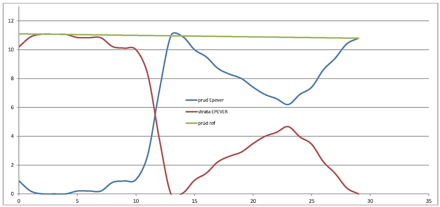 Na priebehu prúdu vidieť špičky do cca 27 A, čo je teda akurát pre 30 A regulátor.