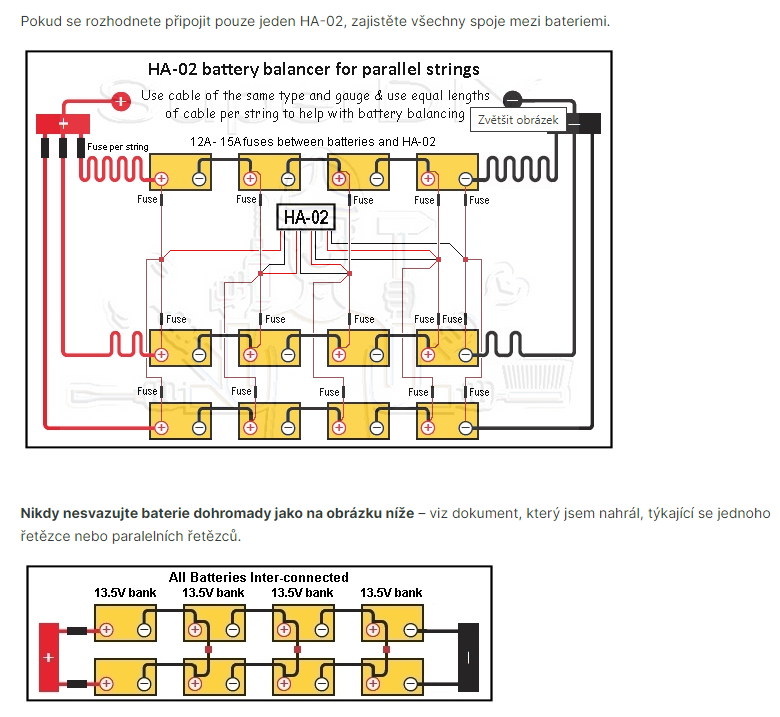 Zdravím. Dokáže někdo objasnit, proč nezapojovat balancer podle druhého zapojení? Na 12V bateriích 2S/3P mám takto zapojeno (HA01) a funguje . Díky.
