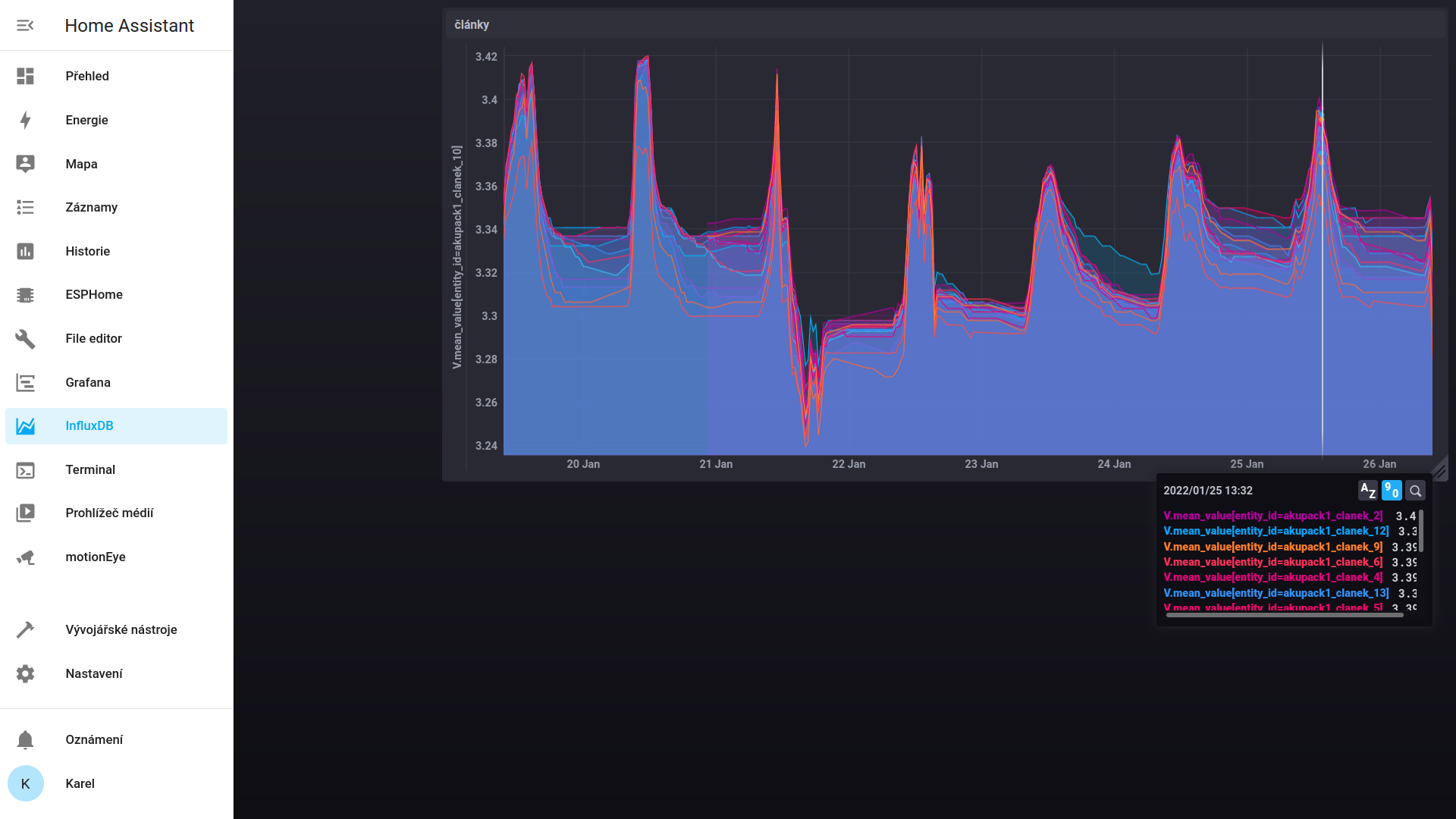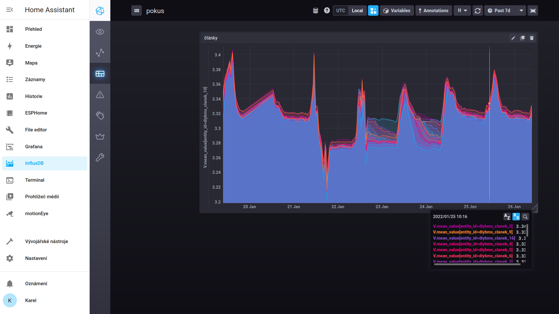 a takhle 5 let: Diybms + homeasistant s influxdb. Část rozdílů je daná nepřesnou kalibrací měření , a vůbec nepřesností měření, ale to, jak jeden článek v jedné i druhé baterce jde první nahoru, je daný jeho menší kapacitou...