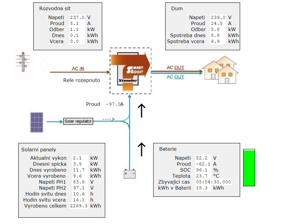 9xRenesola 240Wp+9x Benq 265Wp, 6xTrina 410Wp, 14x Leapton 450Wp, 2xStuder VT65 1xVT 80, 2x XTM4000-48, 40kW Lifepo4..vše ve výstavbě, hotovo 99%. BMW i3 BEV
