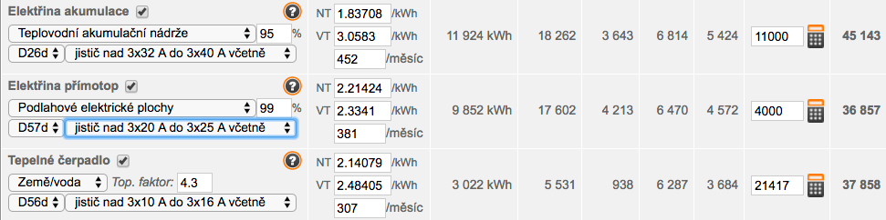 Spíš bych se na to podíval jinou optikou: Stejně budeš mít přípojku z DS. Elektrikou budeš topit, takže sazba D57d. Pokud nenasadíš extrémní technologie, tak musíš mít hl. jistič 3x25A, zaplatíš měsíčne za nic 412Kč, což je ročně cca 5000Kč. pokud spotřebuješ 5MWh v NT, tak zaplatíš celkem 1857Kč/MWh, což je celkem cca 14285Kč, když spotřebuješ 10MWh, tak to bude 23570Kč a když 15MWh, tak to bude 32855Kč, z toho ti potom vyjde, že při spotřebě 5MWh je skutečná cena 2.86Kč/kWh, při 10MWh je to 2.35Kč/kWh a při spotřebě 15MWh je to 2.16Kč/MWh. Nad tím bych se taky zamyslel, jestli fakt není lepší topit jednoduchým systémem se značnou životností (přímotopy, sálavé panely) a nízkou pořizovací cenou, s tím, že předpokládaná životnost do rekonstrukce je víc než 30 let, to ten tvůj systém jistě nedosáhne. Krb může být jako systém záložní, to je pak úplně v pořádku. Ostatně na TZB info je pěkná kalkulačka skutečných nákladů na provoz RD, každej si může upravit svoje čísla, a TČ vychází veskrze nejhůř, hned po propanu, LTO, koksu a obilí. V základu je to nastaveno tak, že začínáme na "zelené louce", tj náklady včetně stavby komína pro tuhá paliva atd. http://vytapeni.tzb-info.cz/tabulky-a-v ... i-tzb-info pro můj dům vychází úspora přímotopy oproti TČ 7000Kč ročně... A to mají pro TČ optimistické default hodnoty servisních nákladů a odhad životnosti, realita je jinde. Sám vidím, kolik ventilů a jiné bižuterie vyměňuju na vodovodu, tohle nebude o nic lepší, spíš naopak.
