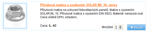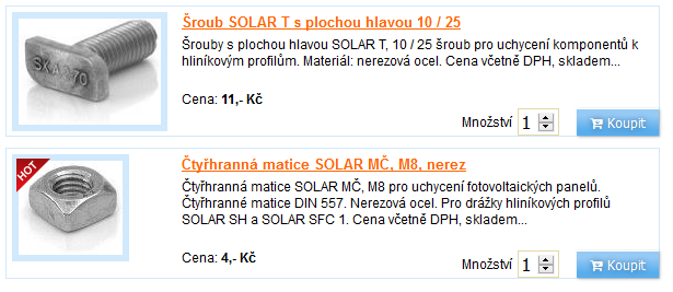 Já dávám místo T šroubů klasický nerez M10x16, to se taky neprotočí, jenom je potřeba si je do profilu předem zasunout, ale to snad není tolik práce navíc, za desetikorunu rozdílu ceny se to dá zmáknout. A ta čtyřhranná matice M8, když na ní není napsaný SOLAR tak stojí taky míň https://www.strechylevne.cz/ctyrhranna- ... a2-p36565/ třeba zde, já to kupuju v normálním železářství.