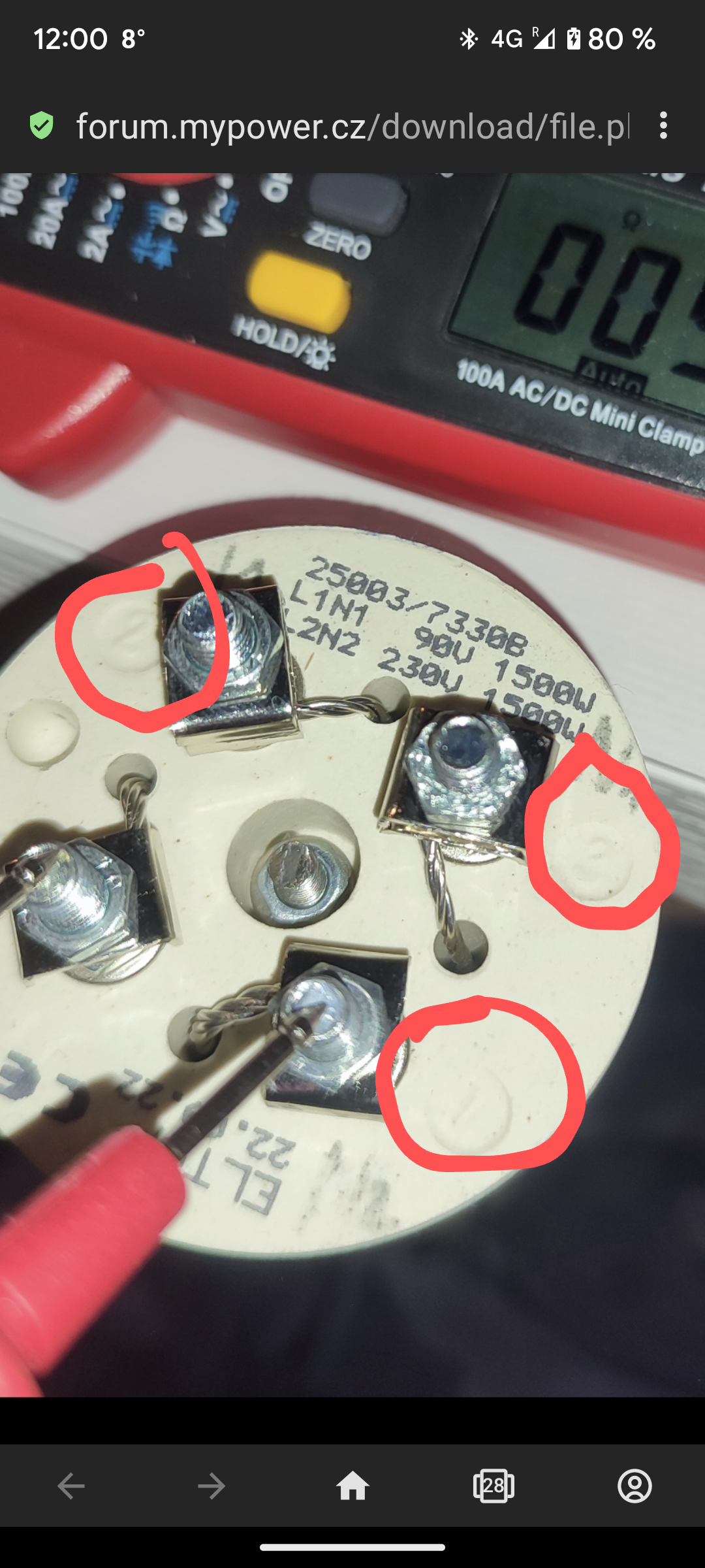 Takže ako je uvedené v tom tlačenom popise, že špirála 230V je L2 a N2, tak by to mali byť tie horné svorky, a jednotky (90V) sú spodné.
