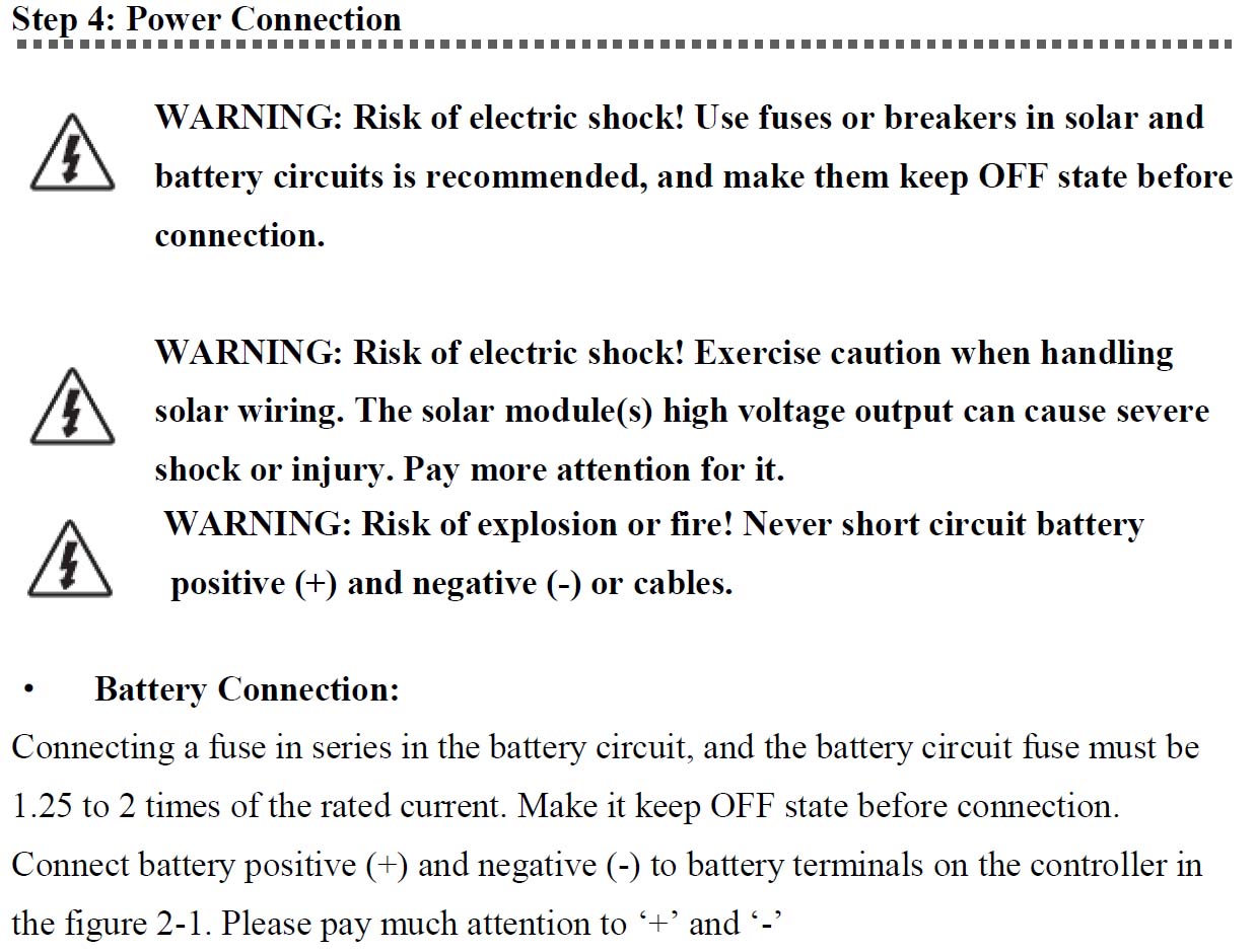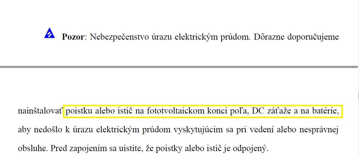 Koukl jsem do dvou návodů - regulátor Etracer a Axpert a v obou je použití extra jištění mezi baterii a regulátor doporučeno. U Etraceru to tady nemusí být zřejmé, ale v dalším popise uvádějí, že po zapnutí pojistky/jističe má naběhnout Etracer, takže je jasné, že i oni myslí jistič mezi baterií a regulátorem: