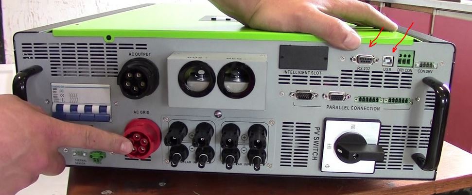 Pokud by ses do budoucna chtěl hrabat v nastavení měniče, tak prostě použij software Solar Power a připoj si laptop na ten RS232 DB9 konektor, do kterého máš teď zacvaklý monitoring. Pokud bys nechtěl vytahovat kabel monitoringu, můžeš se připojit přes USB port, viz šipky na obrázku dole. Ten USB port se po připojení k laptopu bude hlásit jako USB-to-Serial konvertor, takže pak jen v Solar Power nastavíš správné číslo portu.