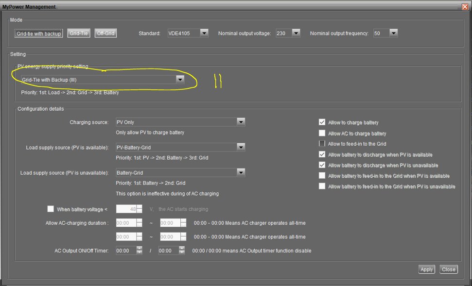 Zvláštní, když jsem měl v Allow AC-charging duration: samé nulové časy tak měnič nikdy z akumulátoru neměničoval vše šlo z panelů a ze sítě pokud byla přítomná. Tady to funguje při tomto nastavení?youda píše: