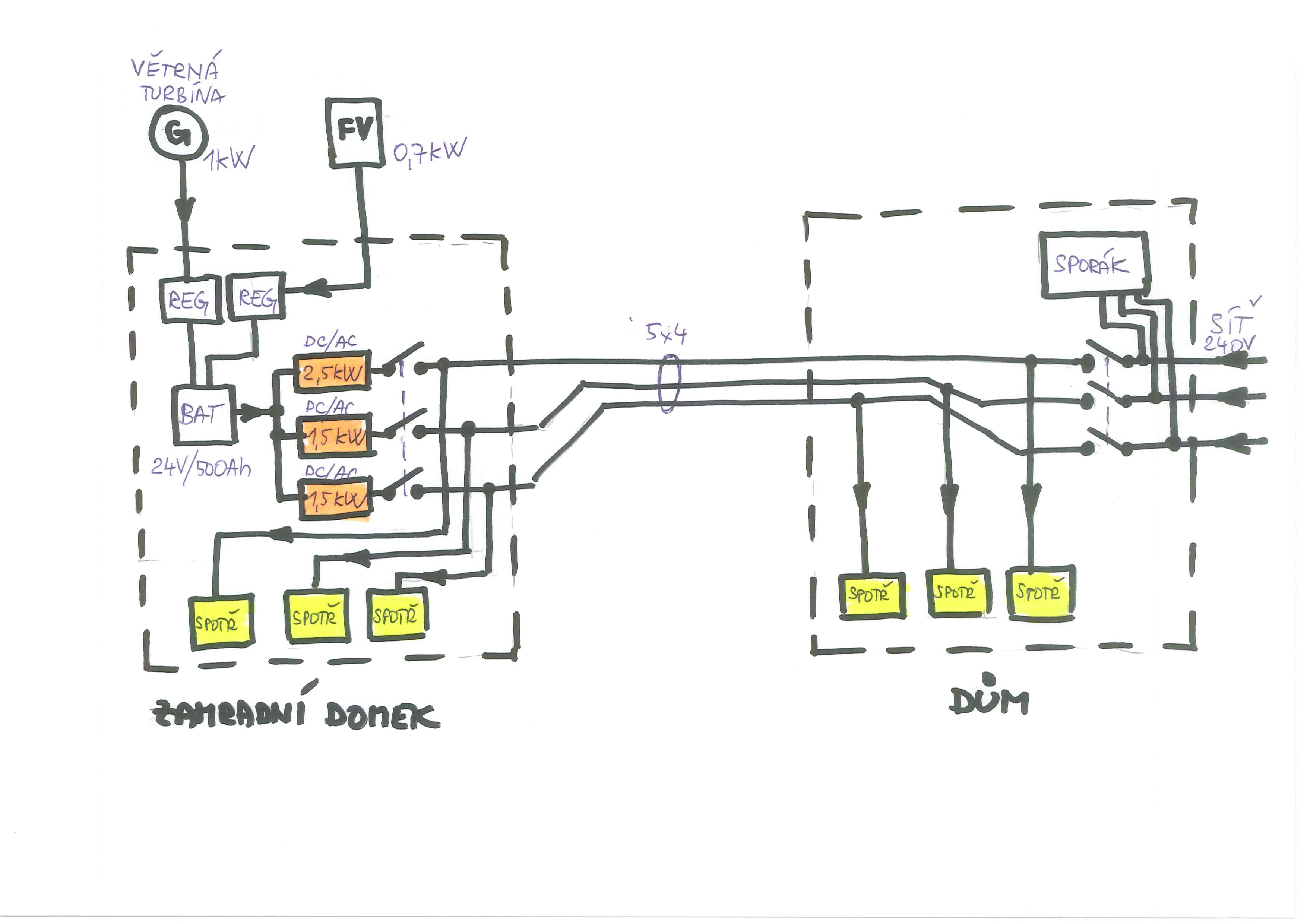 Bohužel, je to neměnné. Další kabel tam nedám, je tam beton. Proto jeden kabel oběma směrama. Na tři fáze je to rozdělené, protože chci využít stávající zapojení v domě, a navíc mám už ty tři měniče (čistý sinus) koupené. Jsou trochu naddimenzované, pro jistotu - vím, budiou víc žrát. Napájet budu běžný věci, spotřebiče na 24V nebudu kupovat. Lednice 0,8kW denně, mrazák - 160W příkon (denně 1kW), 3x PC, 2x televize, osvětlení, v zimě oběh. čerpadlo - 60W, plyn.kotel - 200W. Sporák a rychlovar. konvice pojede asi pořád na síť. Tzv. poloviční ostrovní režim. Musím snad jen vyřešit ochranu , aby se nedaly vypínače zapnout oba naráz.