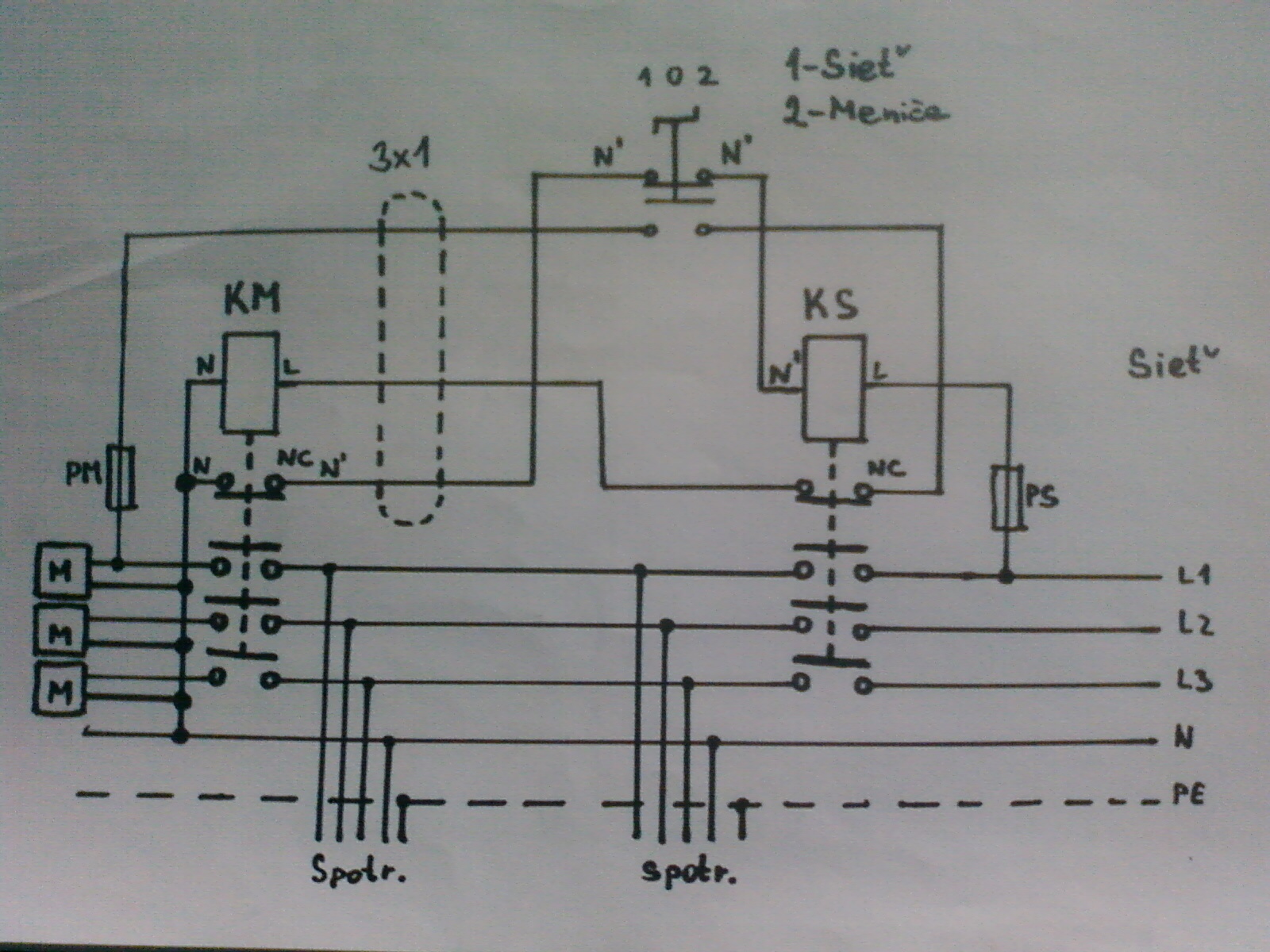 --Po druhej žile by išiel ovládací nulák N´´ cez rozpínací kontakt KS, cez prepínač, z domu, do záhradného domku, na cievku stykača KM. Druhá strana cievky stykača KM, by bola napájaná cez poistku PM, priamo z meniča.