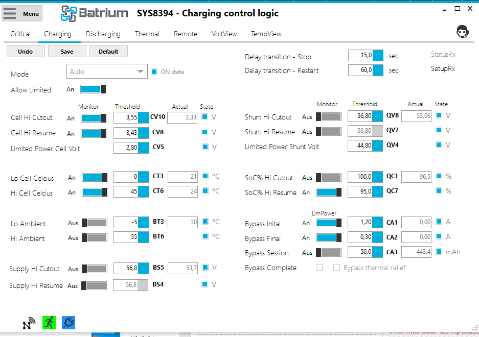 Napětí, proudy a vše kolem se pak nastavuje v Batriu, položky v Control Logic. Super je že se to dá dělat přes aplikačku v pc, a běhá to po wifi.
