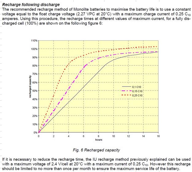 Fiamm Monolite sú staničné batérie, kde sa predpokladá len občasné vybitie, ktoré sa potom kompenzuje viacdňovým nabíjaním na úrovni float. Tu máme ale režim s každodenným vybíjaním o niekoľko % - v rozumnej miere do max. 75 % SOC. V tomto režime je nevyhnutné nabíjať resp. vyrovnávať napätie článkov pri absorpčnom napätí, pretože ináč by batéria ako celok začala trpieť nerovnakou kapacitou článkov.