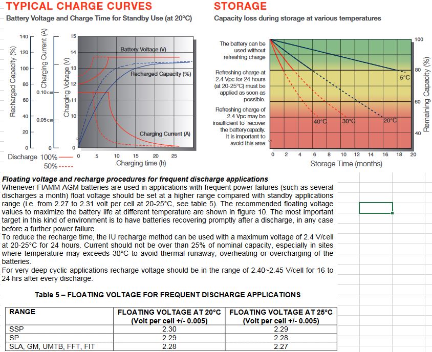 Je tam napísané že doporučené nabíjanie z hľadiska životnosti je nabíjanie FLOAT napätím čo je 27,24V (20°C) resp. 27,12V (25°C). A pokiaľ sa jedná o "vybíjaciu prevádzku, tak by malo byť nastavené na vyššie hodnoty 27,24V, resp. 27,72V.