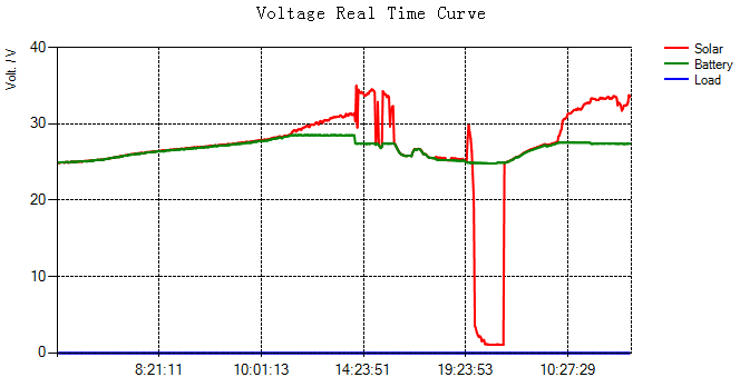 To jasně vidíš, kde se červená odpojí od zelené směr nahoru začne PWM omezovat proud do Aku. Proto se zvedne napětí panelů. Tam kde vyskočilo najednou nahoru přešel po nabití aku do udržovacího napětí. První den možná ekvalizoval. Druhý den už neekvalizoval tak to zabalil rychleji