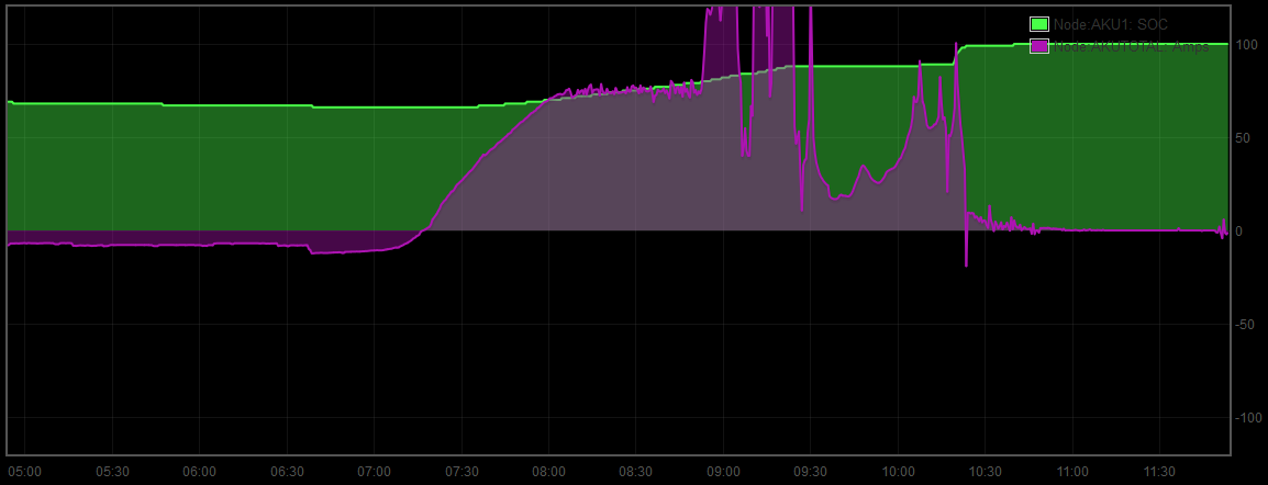 V BMS Pylontechu je sada FETů, které dokážou nabíjecí proud poměrně rázně utnout, pokud se SOC blíží 90%. Je to velmi pěkně vidět i na grafech, kdy u konce nabíjení proud do Pylontechů velmi strmě padá dolů.