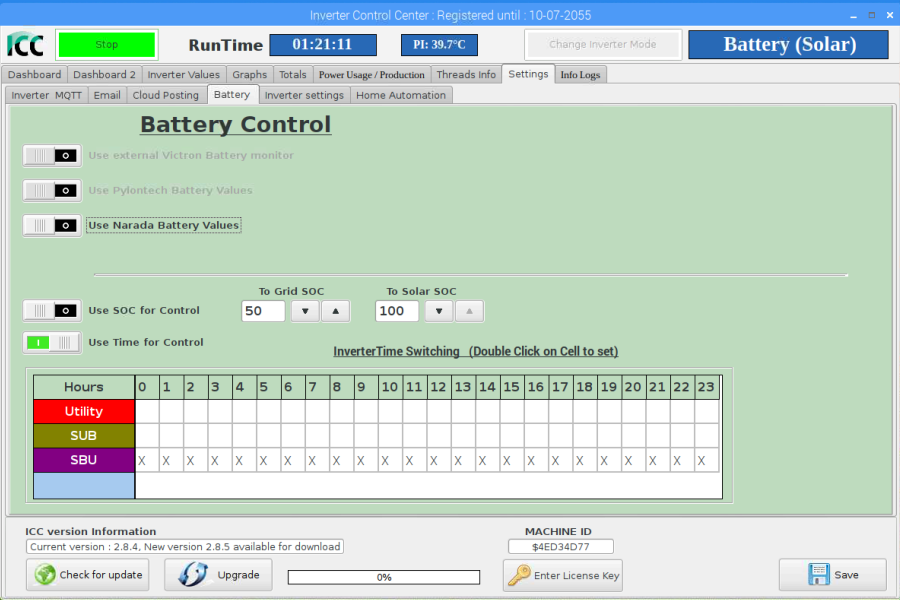 4) test podobný doma po práci změna času v měniči a test - opět při překlopení času v měniči nezávisle na vše ostatní - 23 59 na 0 00 opět změna z SBU na SUB a začalo dobíjení ( bylo 4 nebo 5 odpoledme a měnič měl i PV vstup s výkonem) , přesto začal dobíjet ze sítě