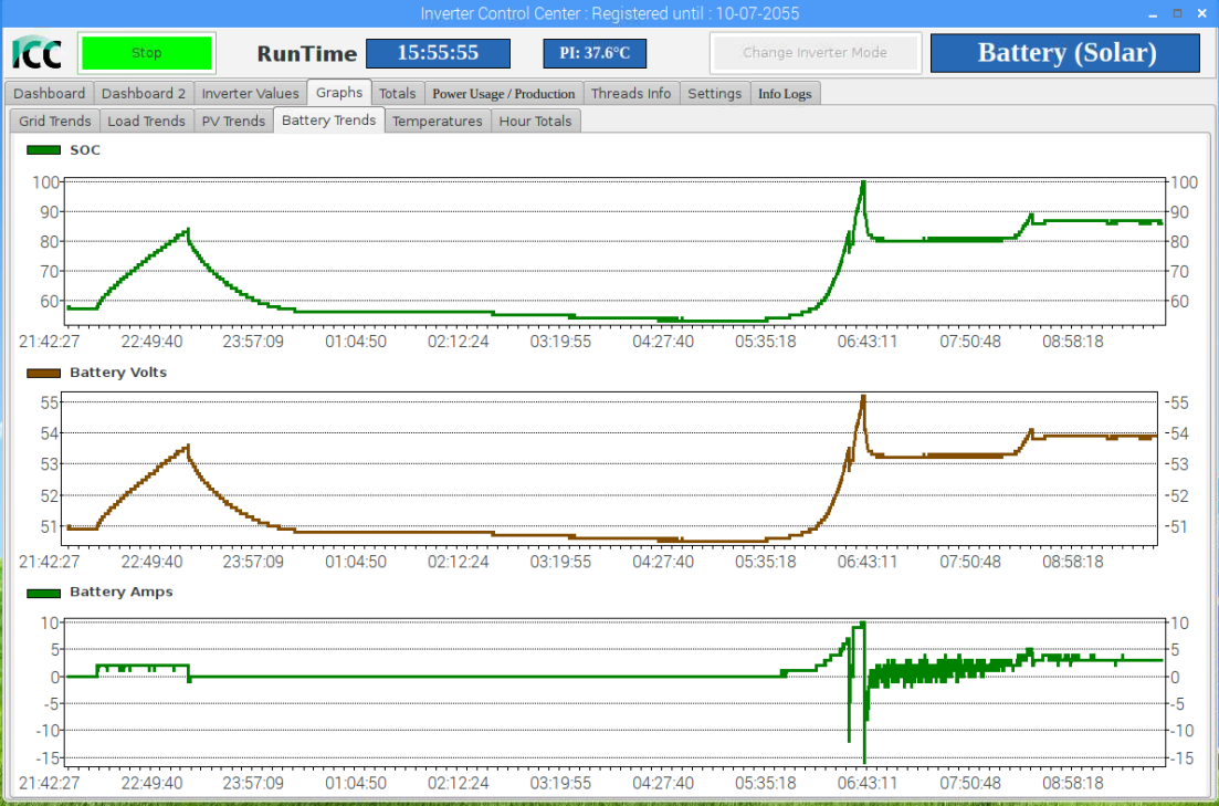 zde přiložen screenshot o nabíjení 2A, které se zaplo ze sítě samo v čase 0 : 00 na měniči . čas v měniči je o 2 hodiny posunut vpřed ( měnič půlnoc, reálný čas 22 00 jak v ICC tak skutečný)