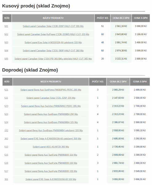 Zdravím, opět po nějaké době nabídka skladových zásob ve Znojmě. Odběr možný po domluvě prakticky kdykoli. Větší množství samozřejmě také není problém, ale při pohledu do dodavatelského ceníku zde už nic nejde pod 300 Wp.