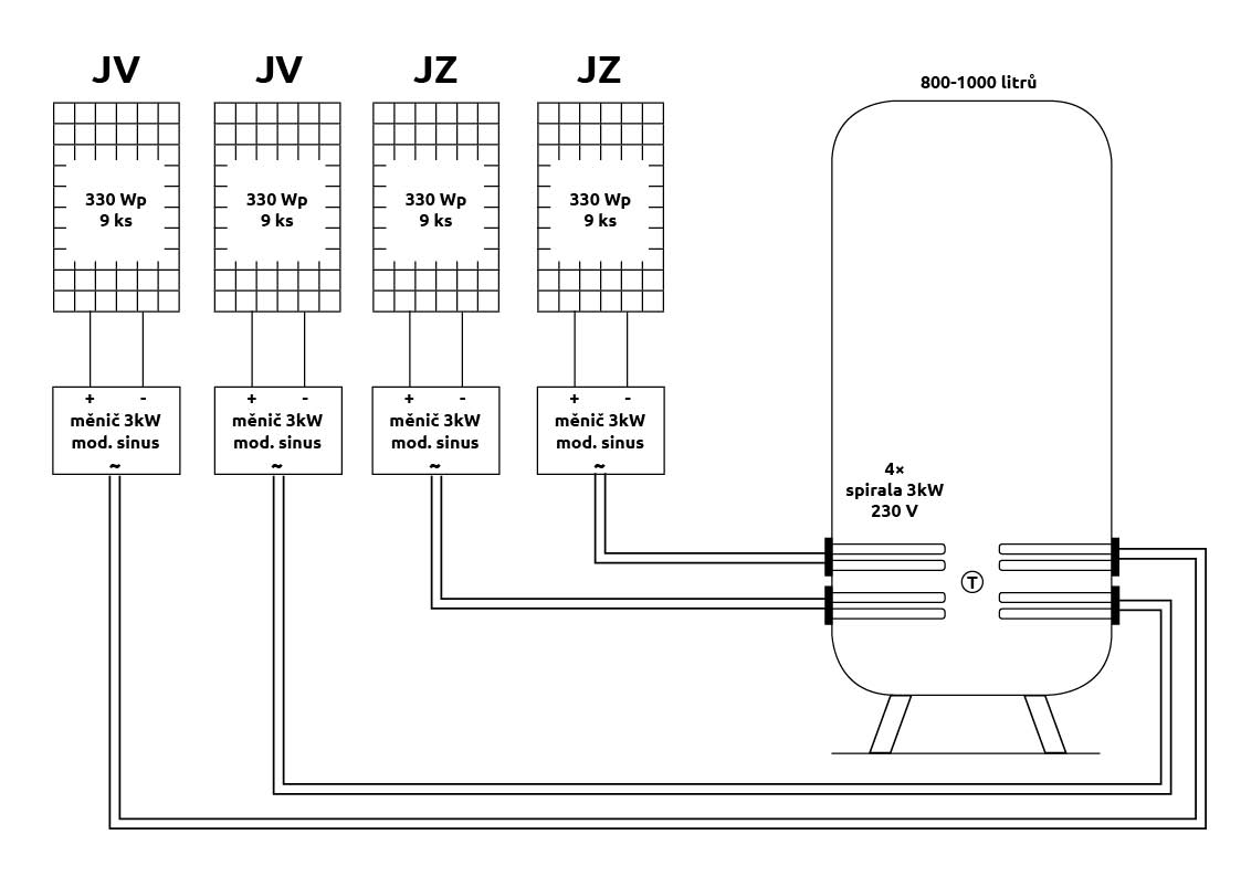 Ja osobne bych nedelal 12kW v panelech jen na ohrev vody. Pouzival bych ty panely primarne pro pokryti vlastnich potreb v elektrine a prebytky bych daval do vody. Nechal bych si udelat suche teleso na napeti baterie... s tim se potom hraje mnohem lehceji. Spinat se to da mosfety, da se udelat nekolik vetvi a spinat postupne...