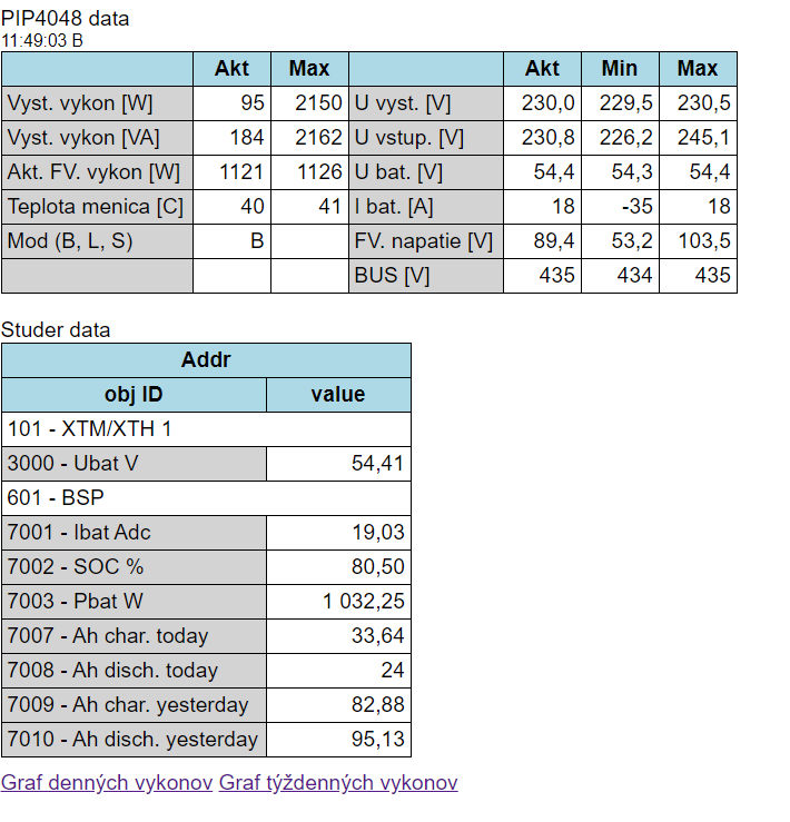 Pozeral som rano do logov a vyzera to tak ze ma opusta PIP4048. Asi sa nahneval ze ho uz pouzivam len ako MPPT regulator. Z logov som zistil ze mu neumerne stupla spotreba naprazdno (mierne cca tyzden dozadu, viac vcera a dnes) aj ked menic je vypnuty, dokonca aj ked sa komplet vypne (noc) tak stale berie okolo 1,4A. Povodne vo vypnutom stave bral menej ako 0,1A. Typujem to na odchadzajuci elektrolyt v DC casti co je spojena s akumulatorom. Rele v MPPT to nie je, to rozopina - skusal som aj odpojit odpojovace od panelov (ak by to bol spatny prud), ale odber zostal.