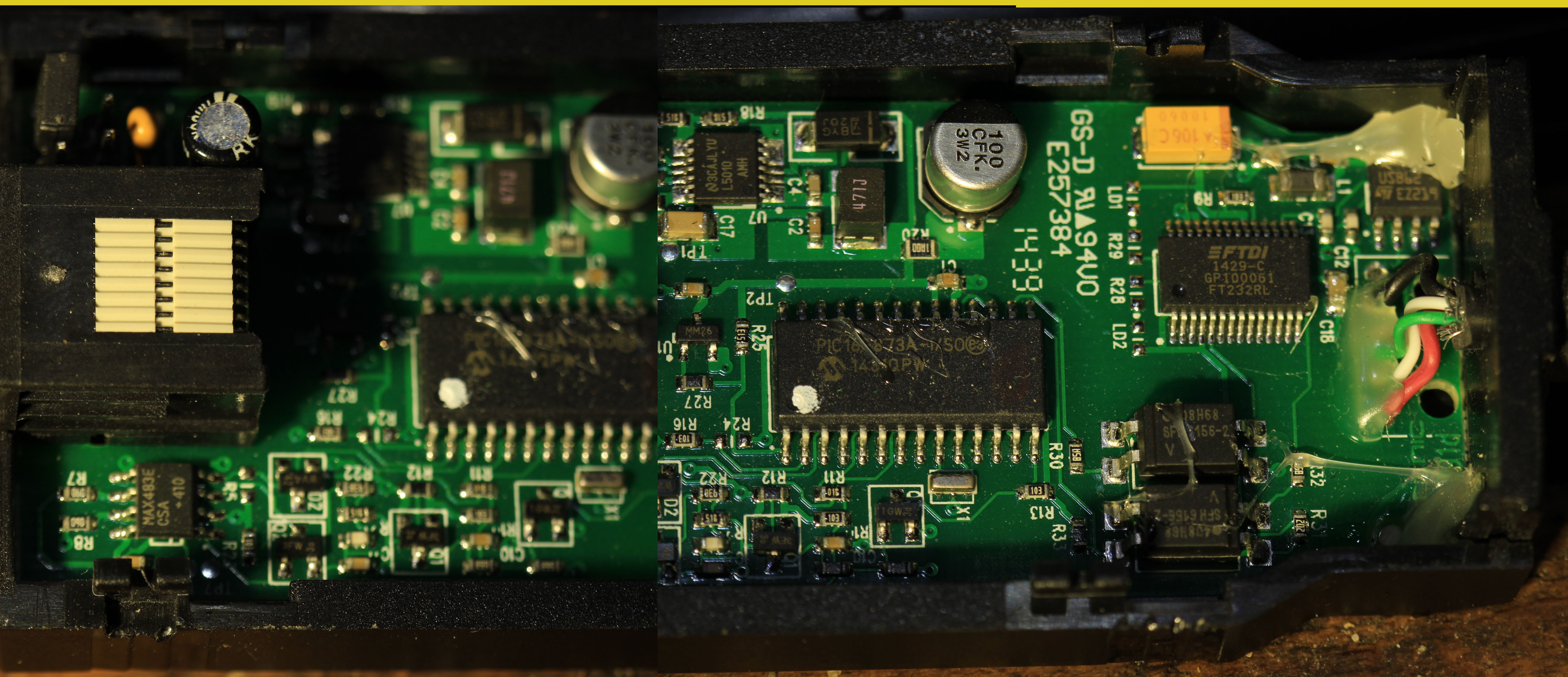 Vpravo je uprostřed microchip pic (fuj ee), podle spojů mu ta sériovka jde tam kam má (uart), no a ven to vypadá nejspíše na CAN nebo RS485 (ale těžko soudit, can ty picy neuměly, na 485 zase nevypadá zapojení, asi to bude nějaká proprietární sběrnice), co je napsáno na tom chipu úplně vpravo nahoře ?